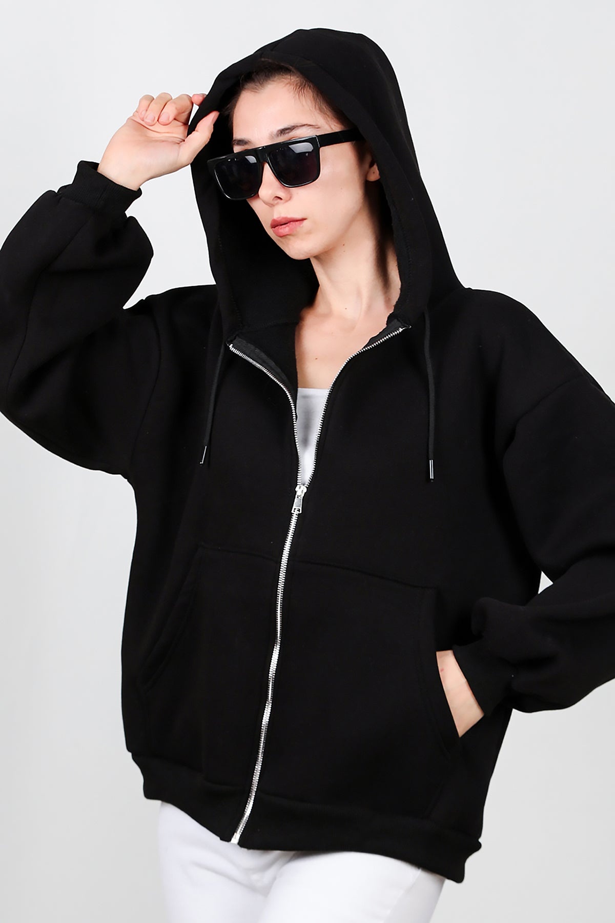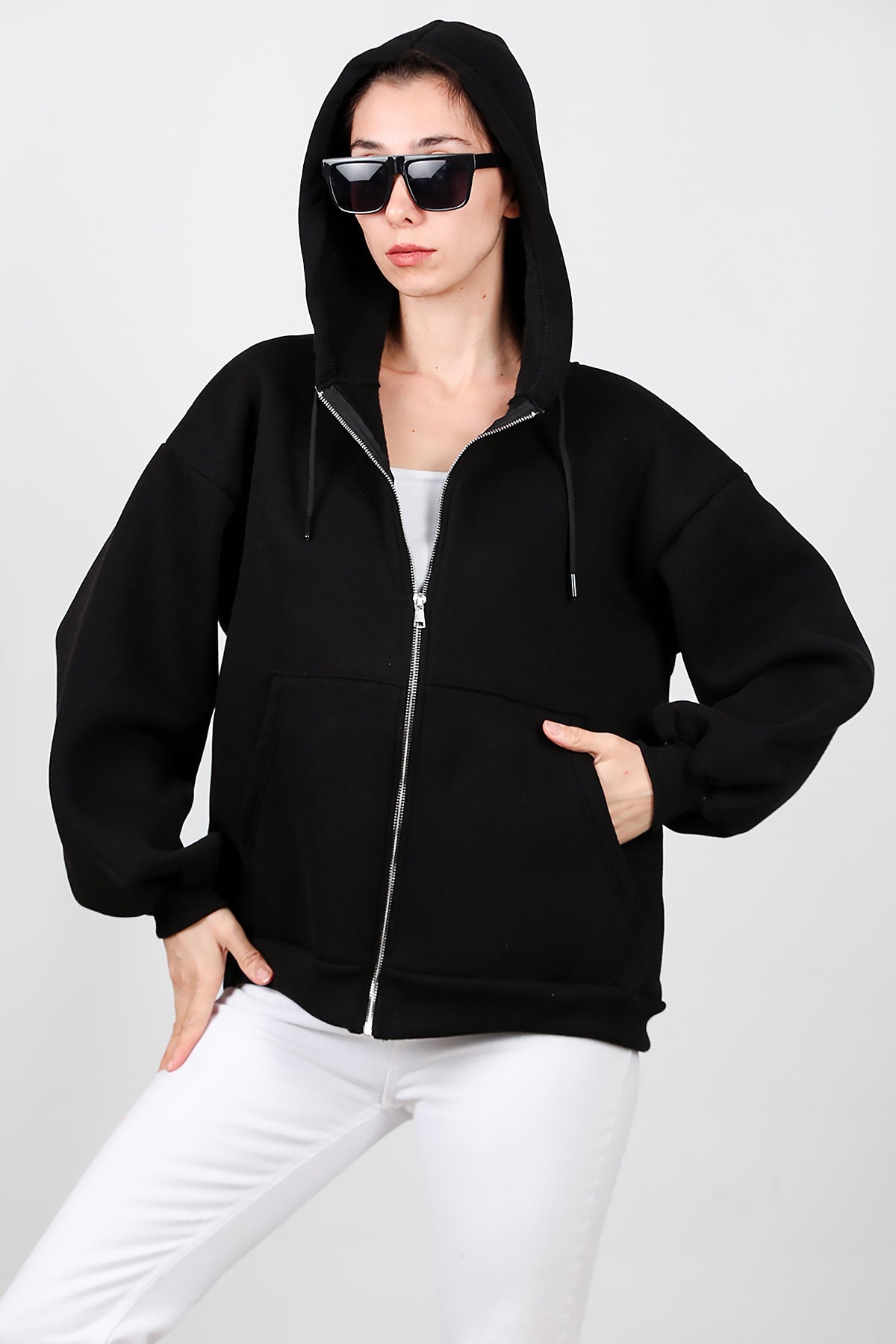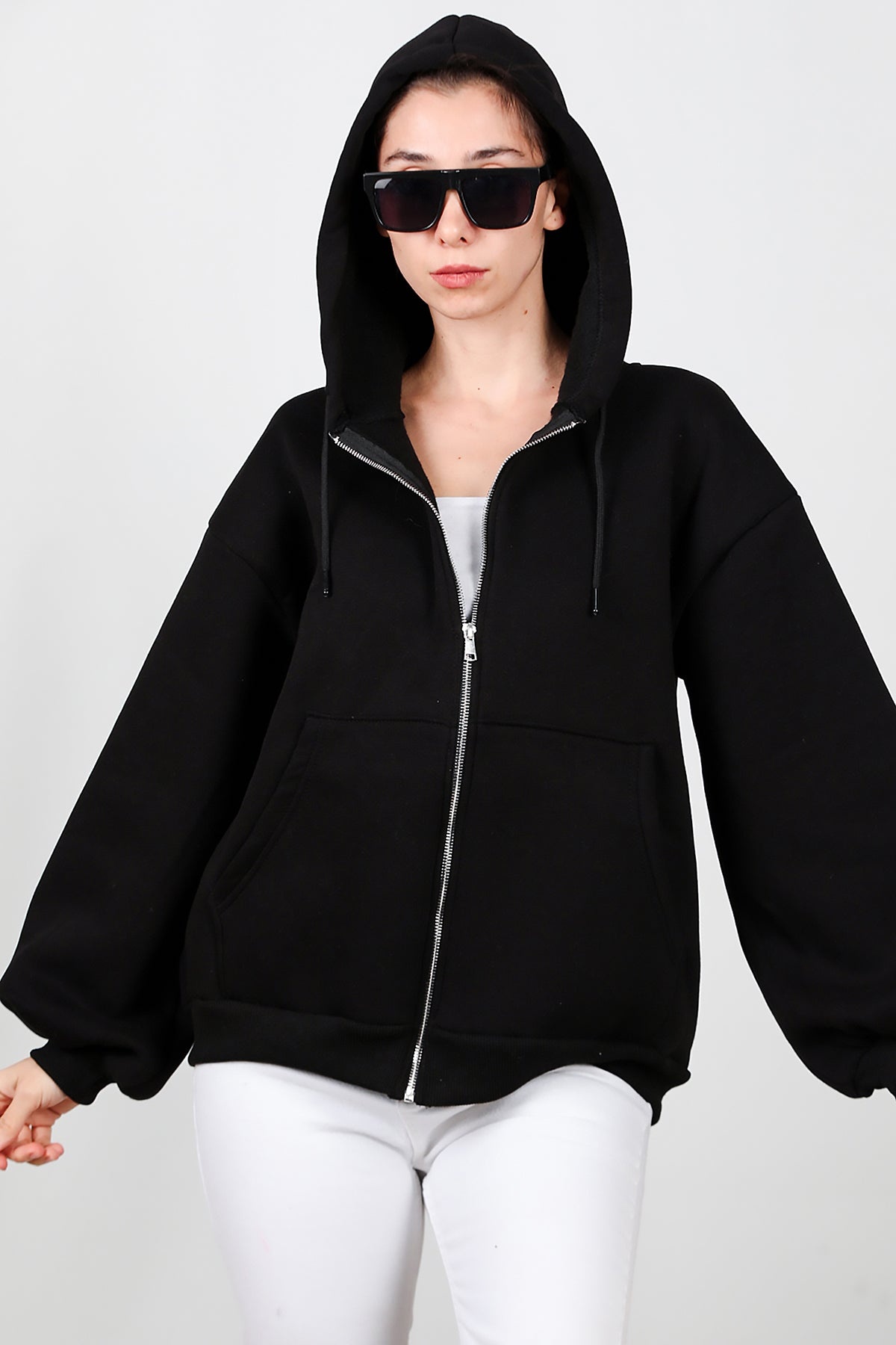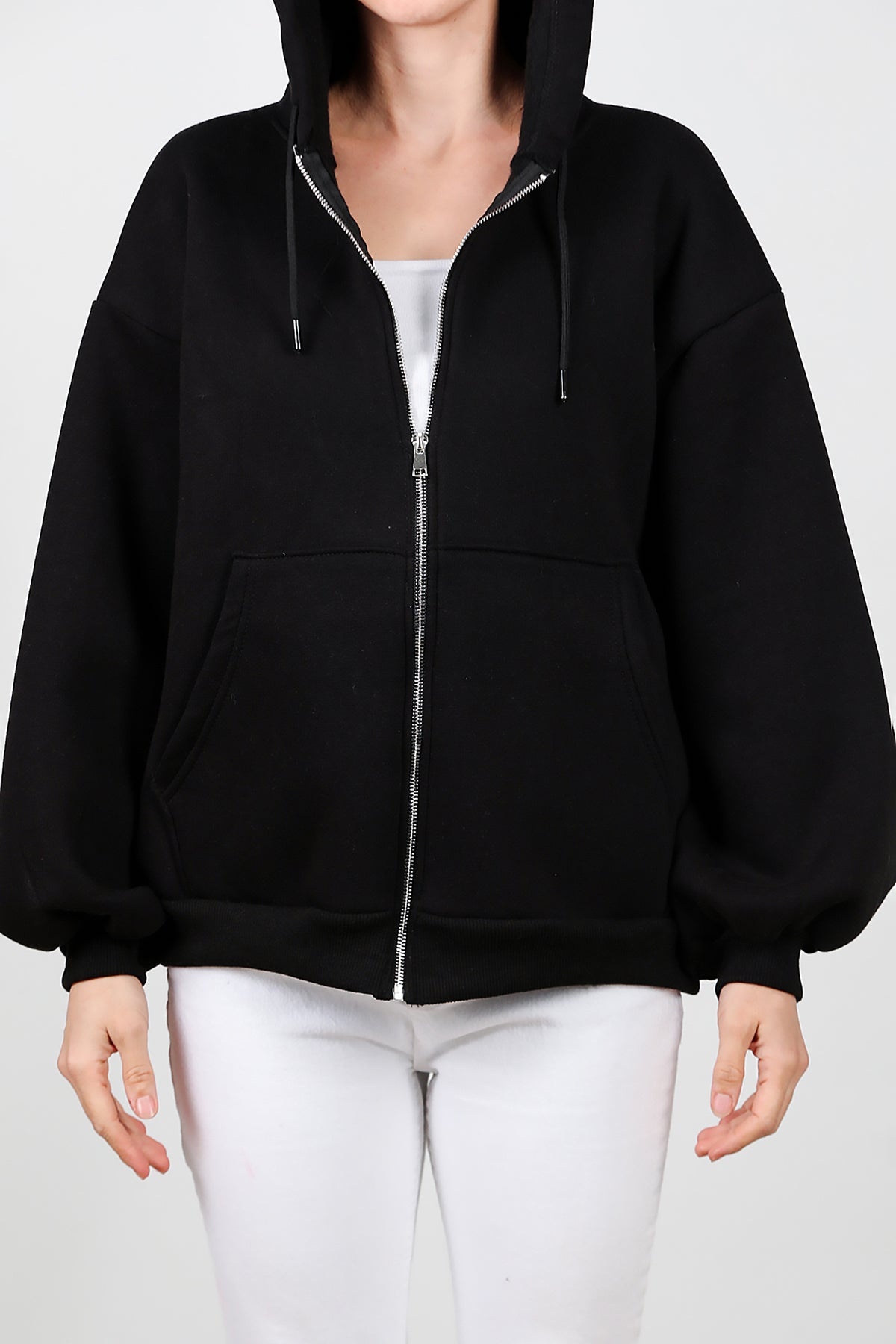 Kadın Kapşonlu Fermuarlı Şardonlu Sweat Siyah
