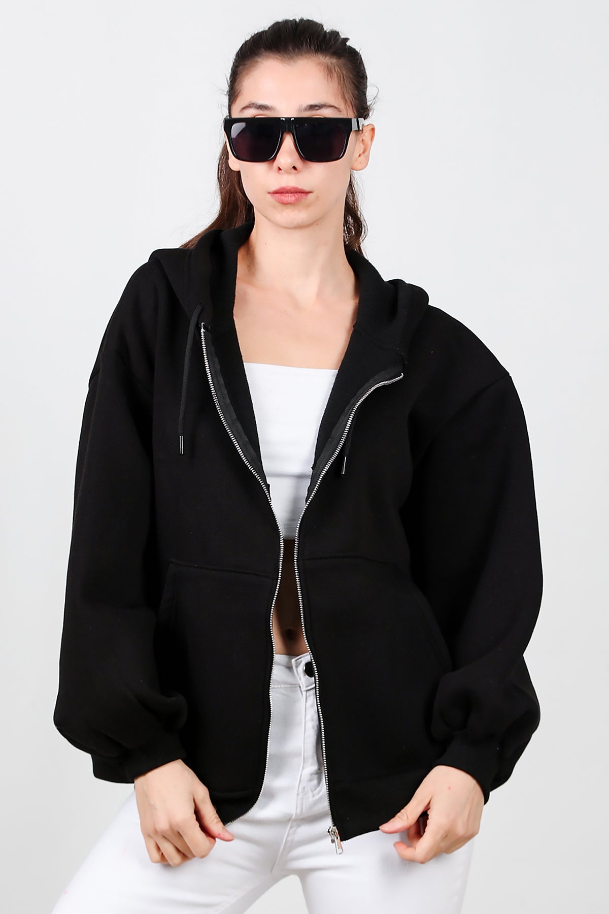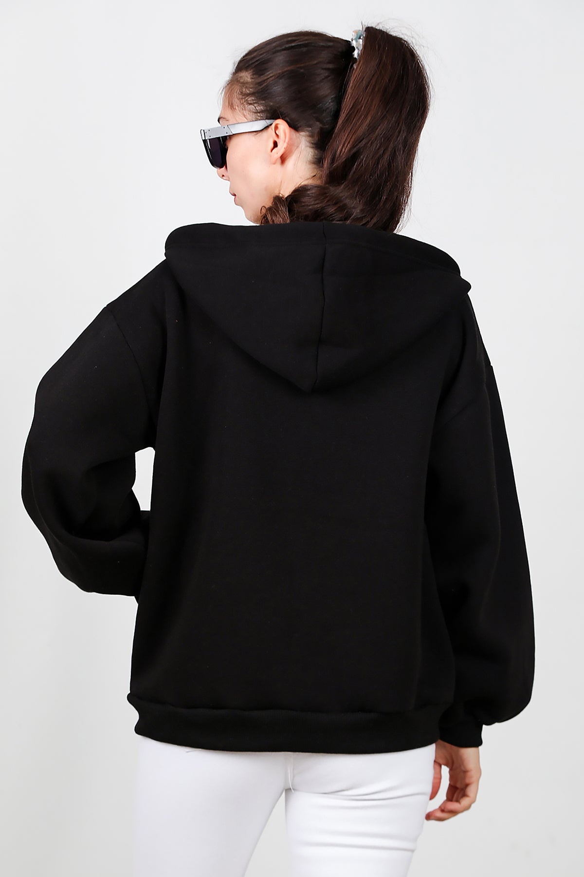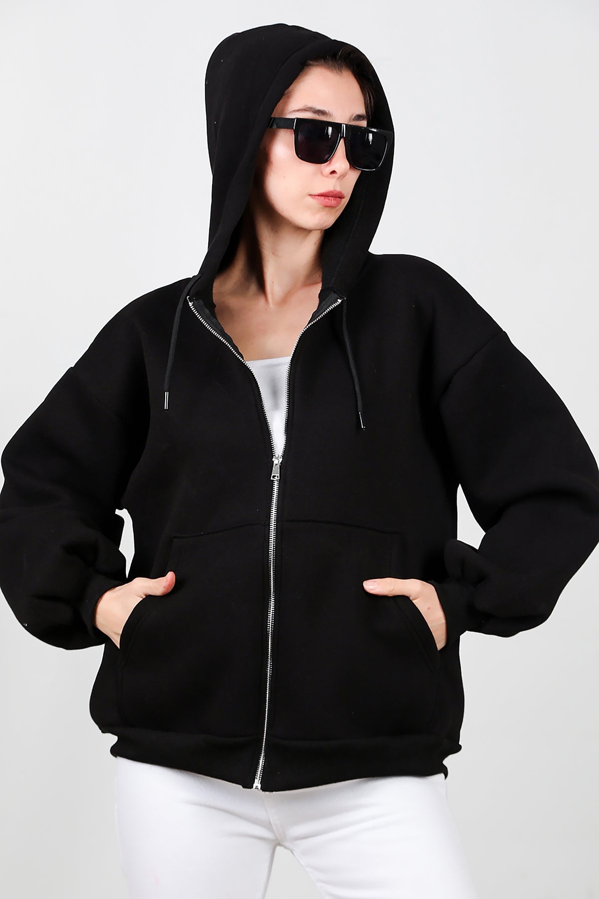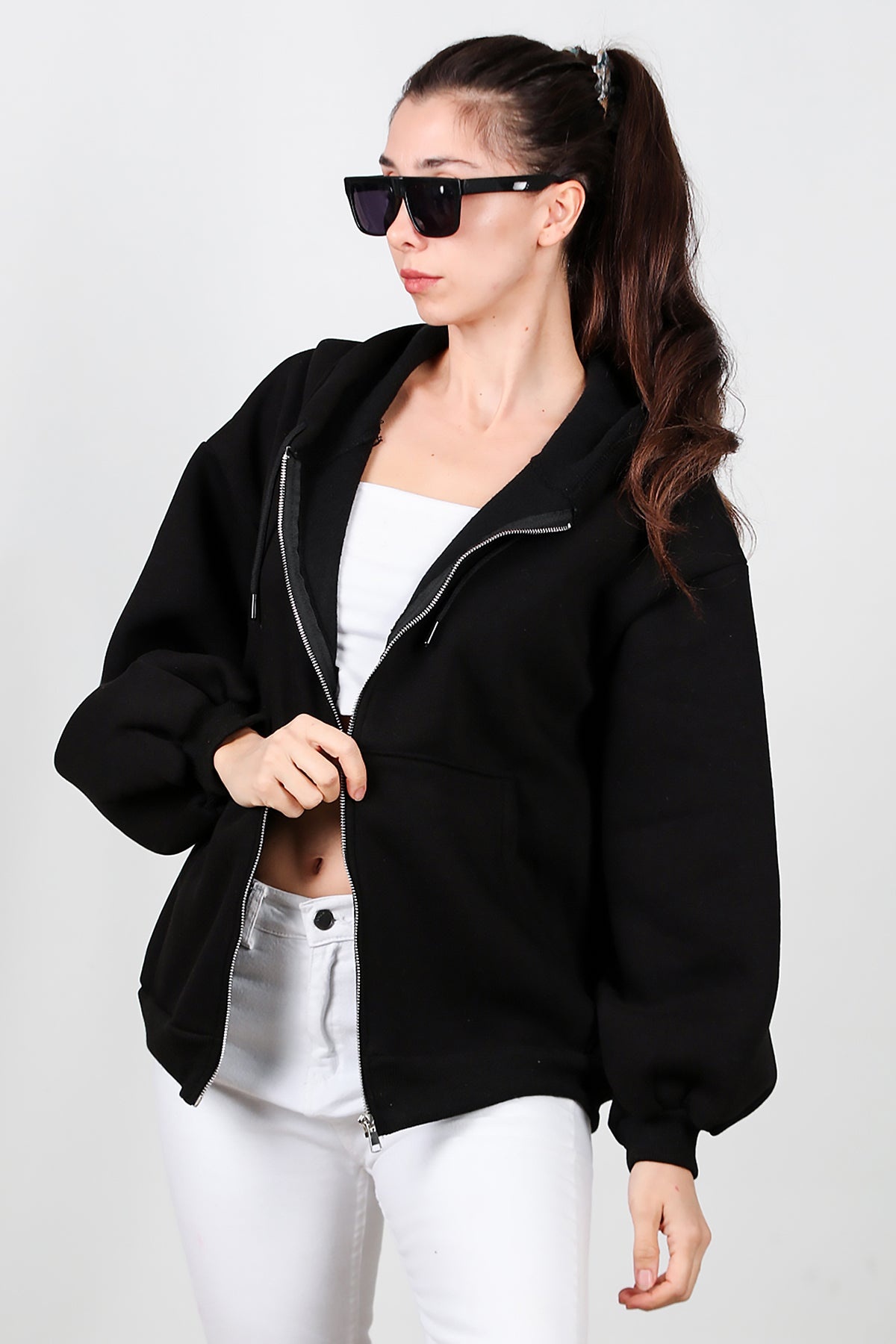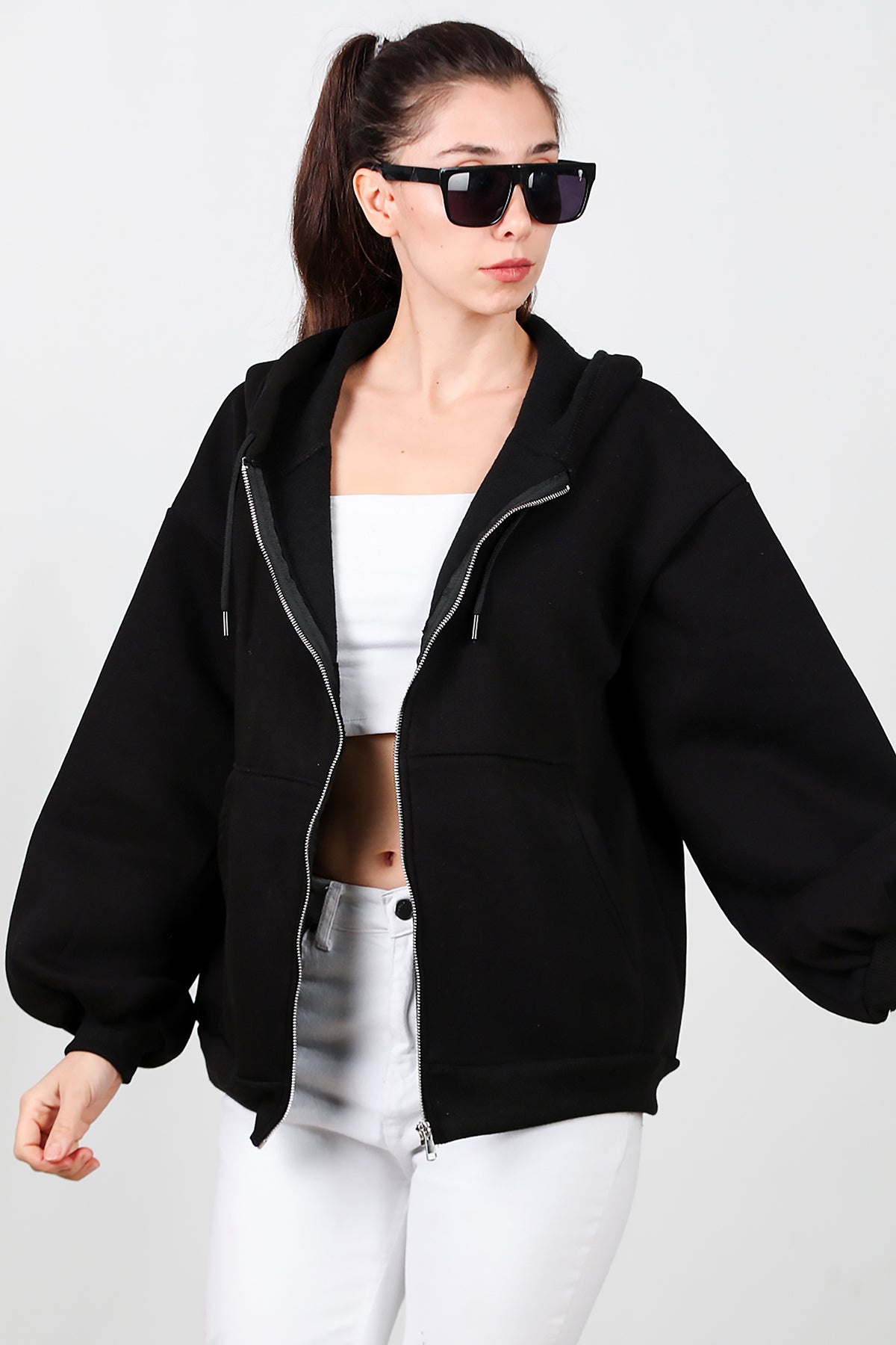 Kadın Kapşonlu Fermuarlı Şardonlu Sweat Siyah