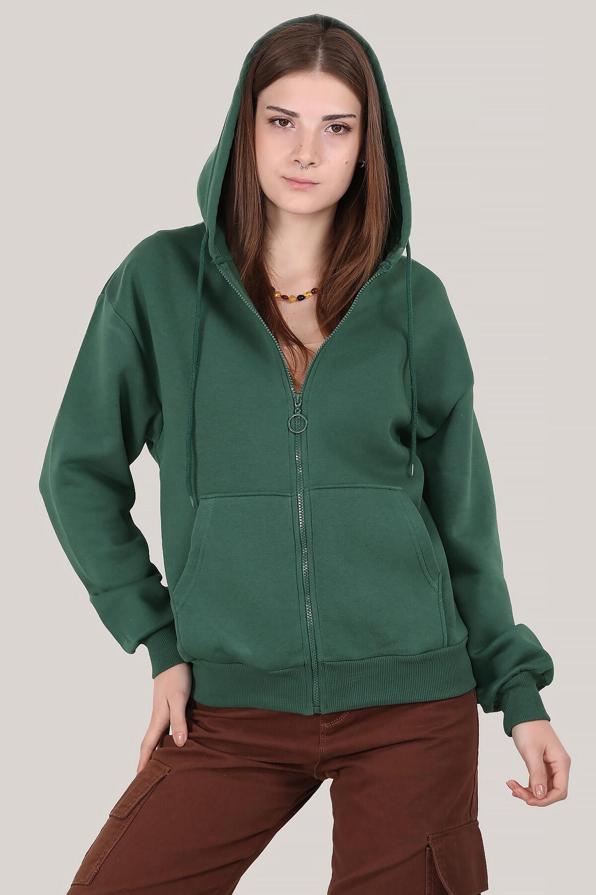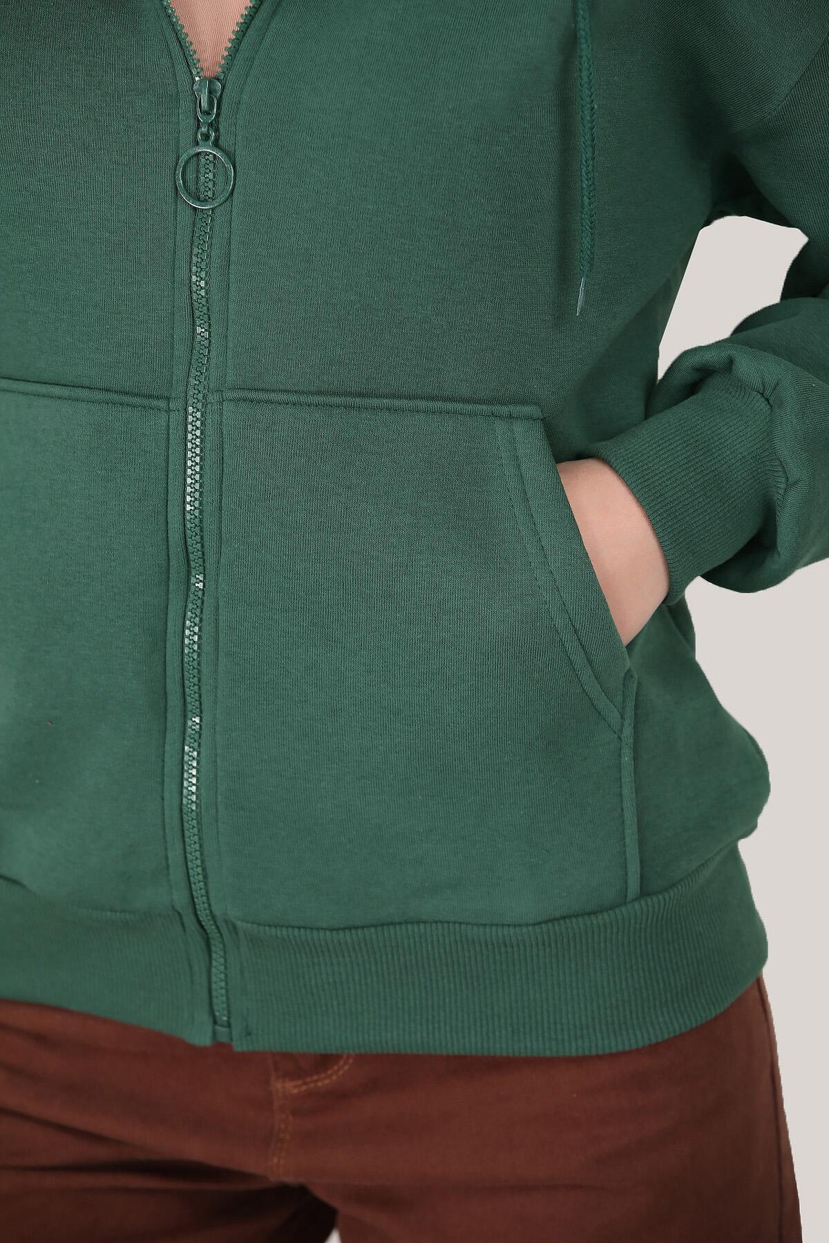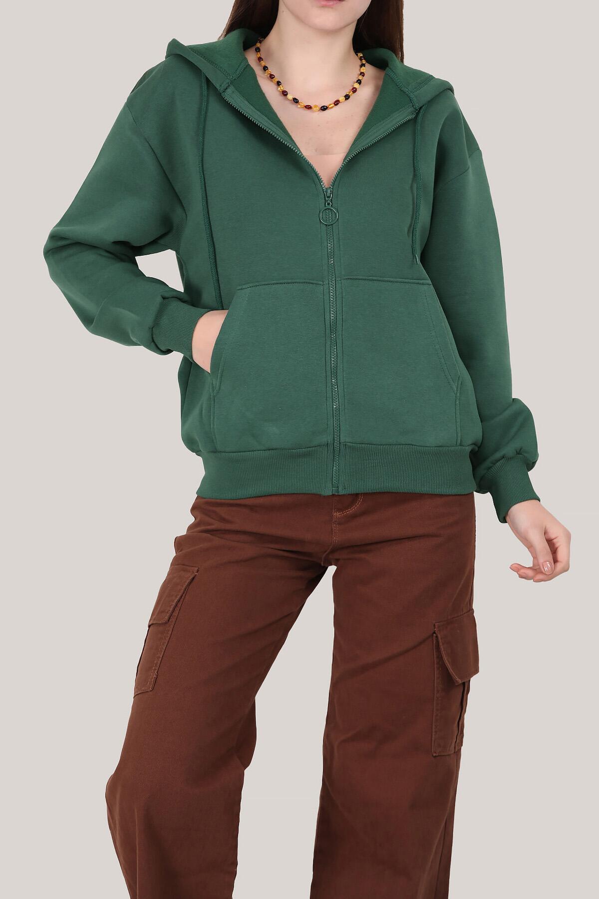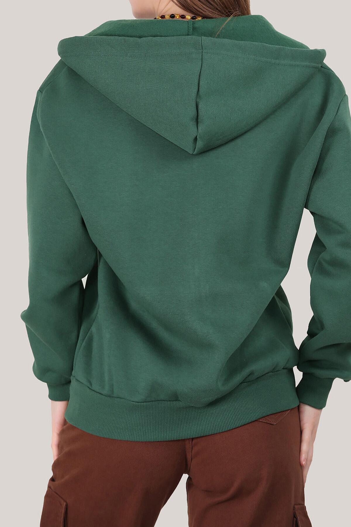 Kadın Kapşonlu Fermuarlı Sweat Zümrüt