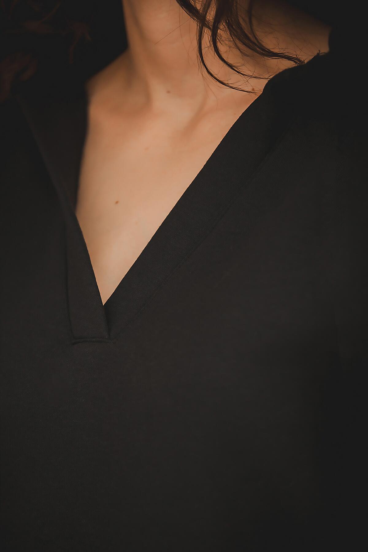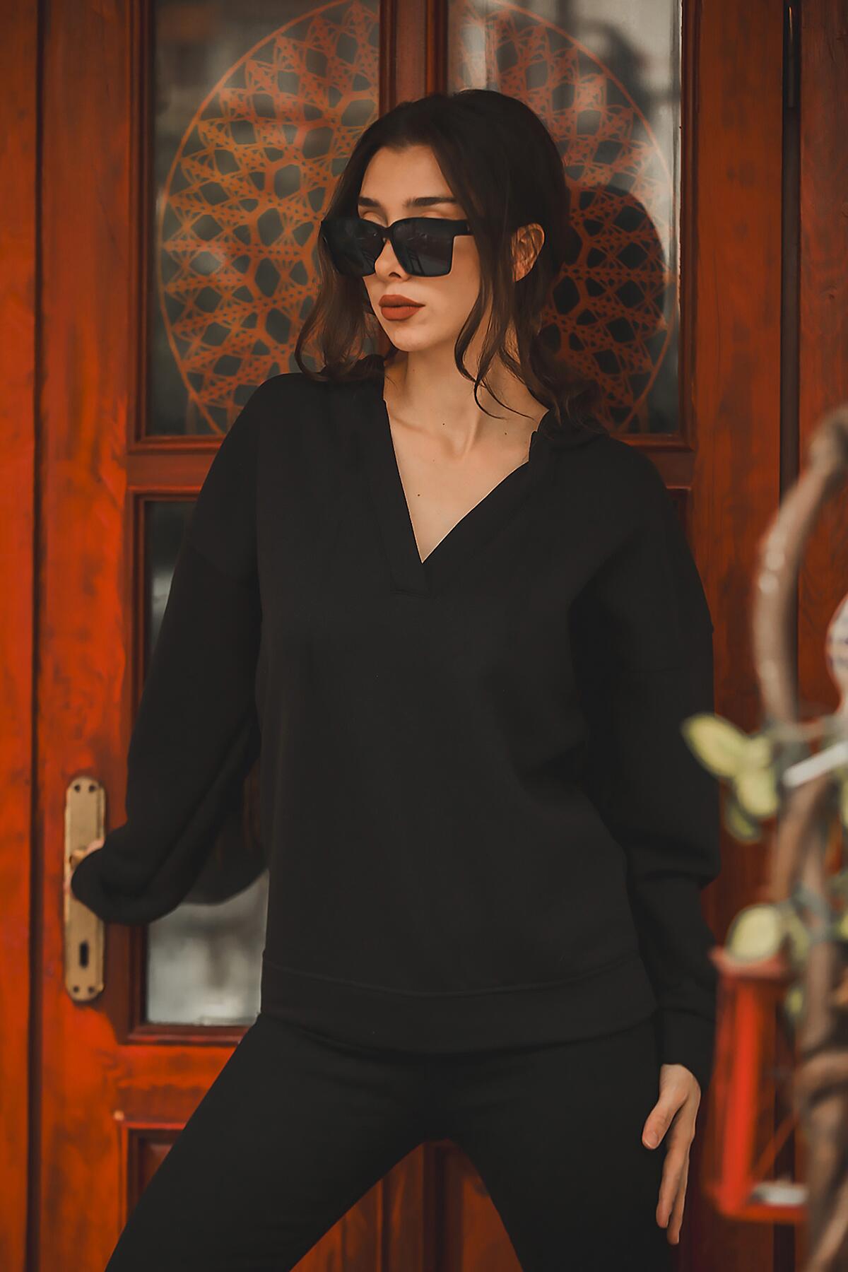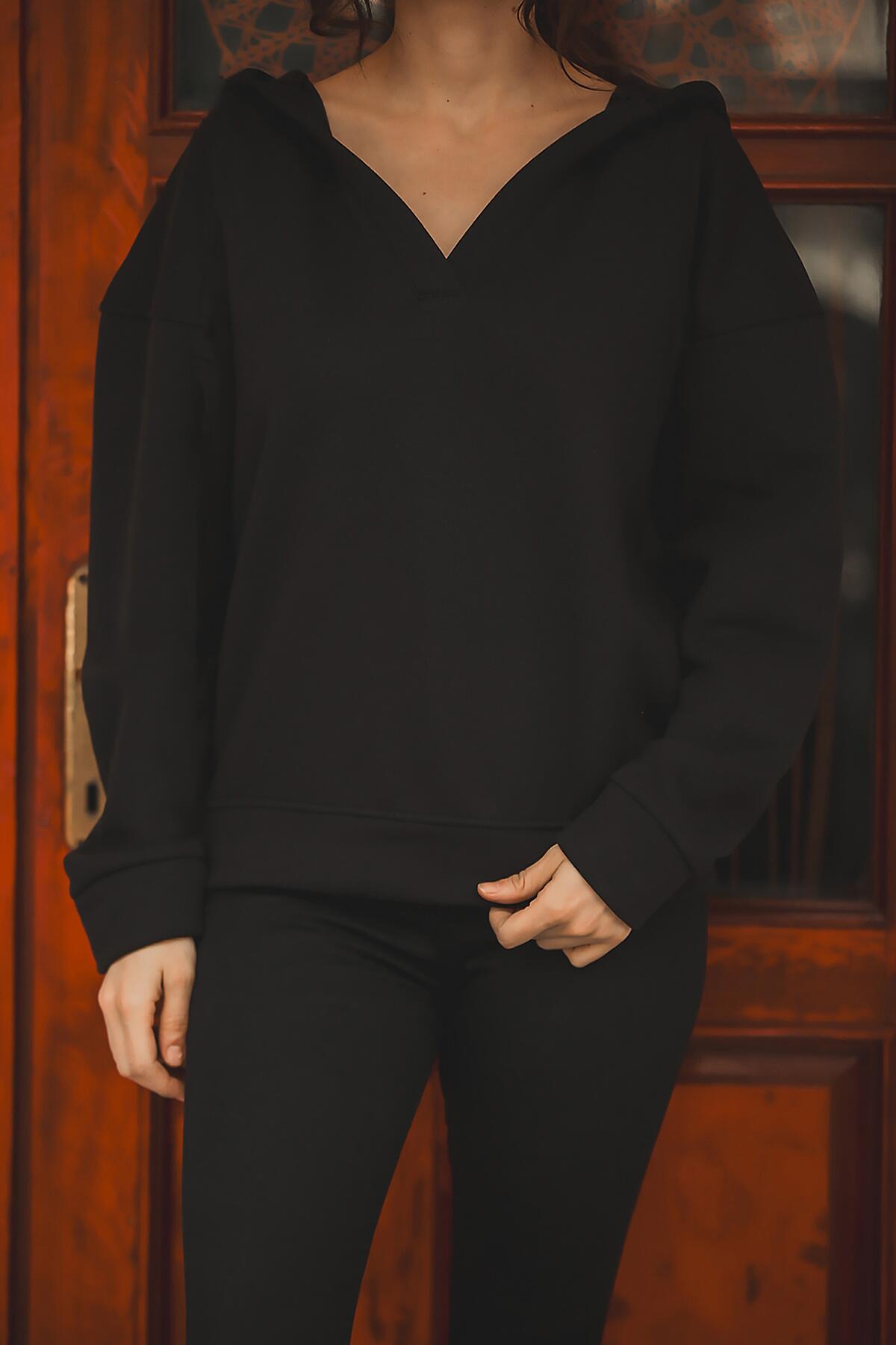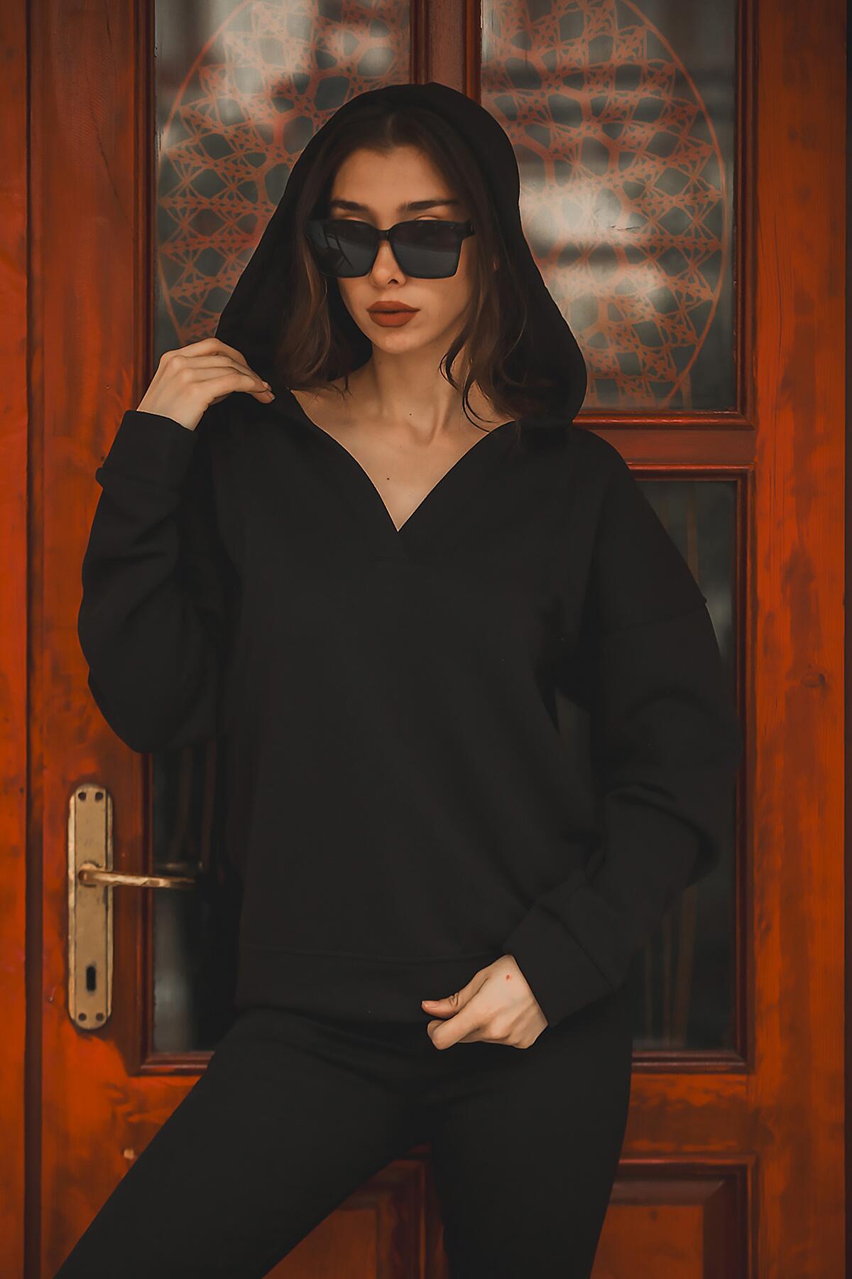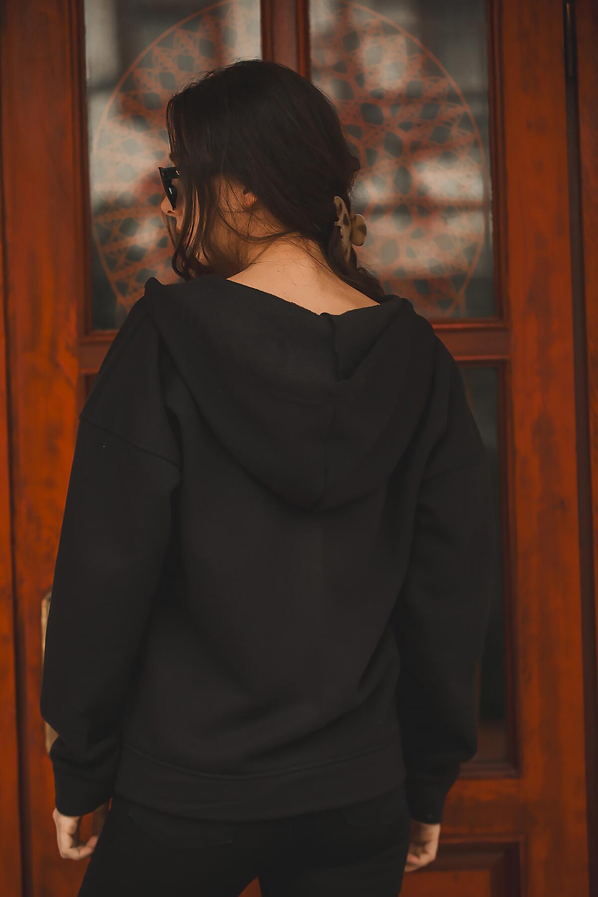 Kadın Kapşonlu Patlı Sweat Siyah