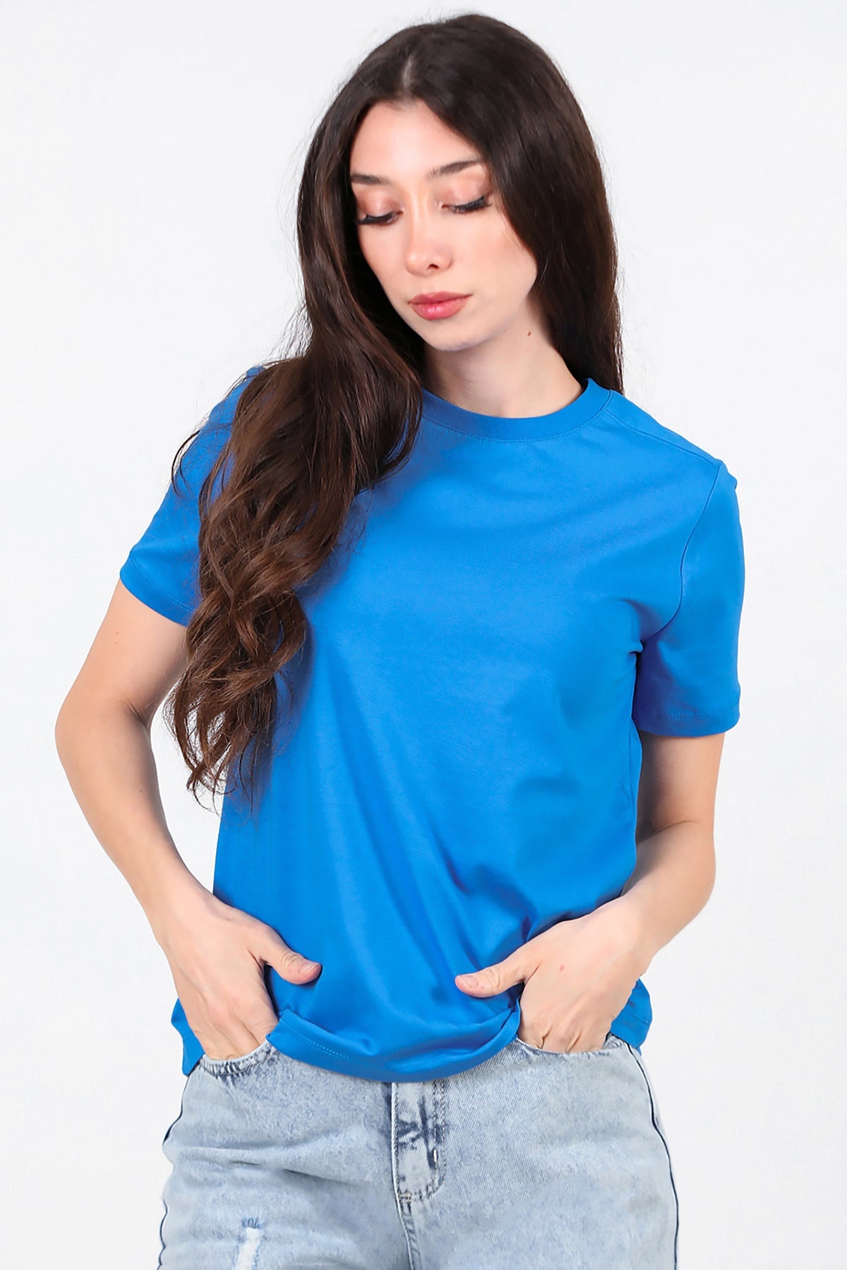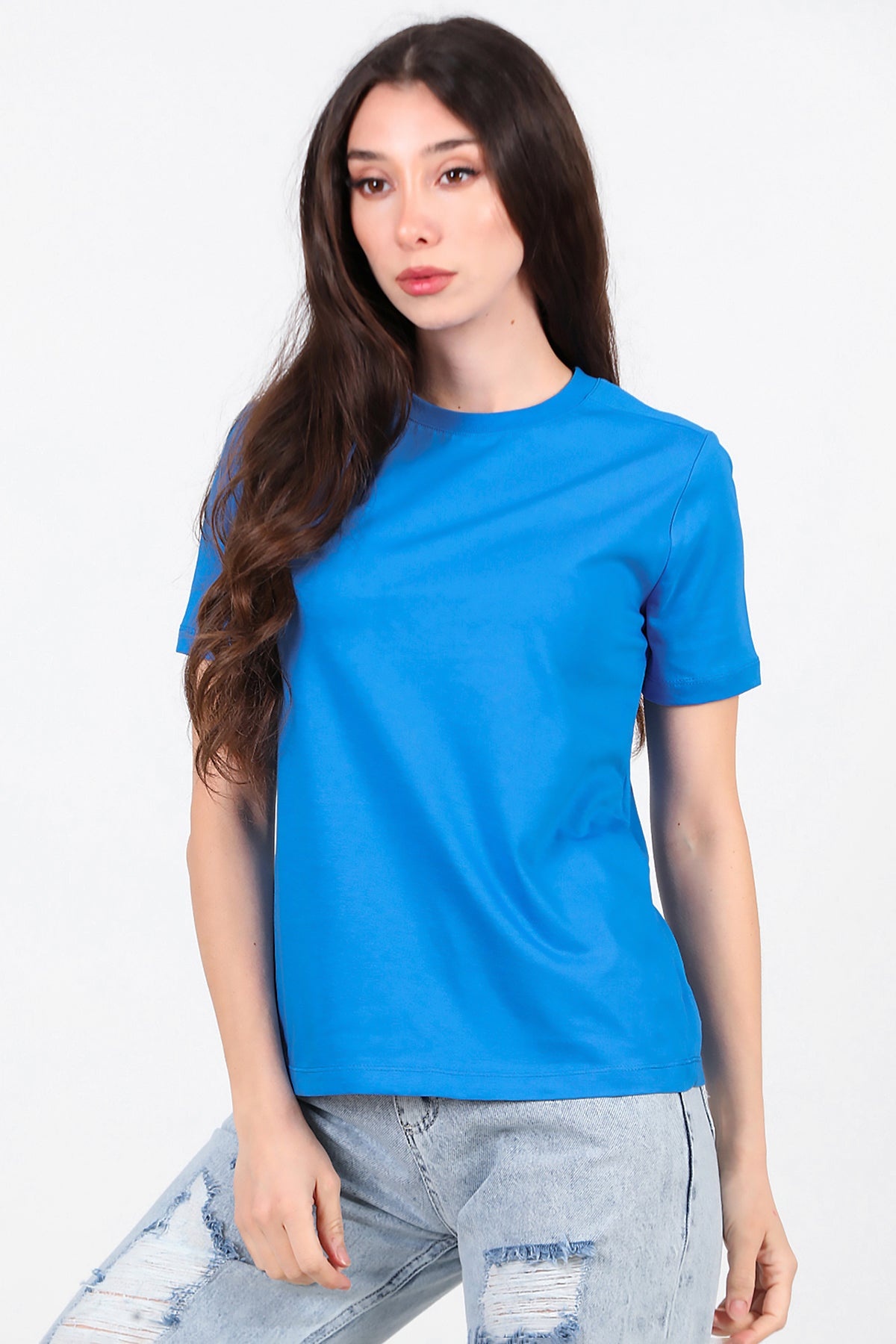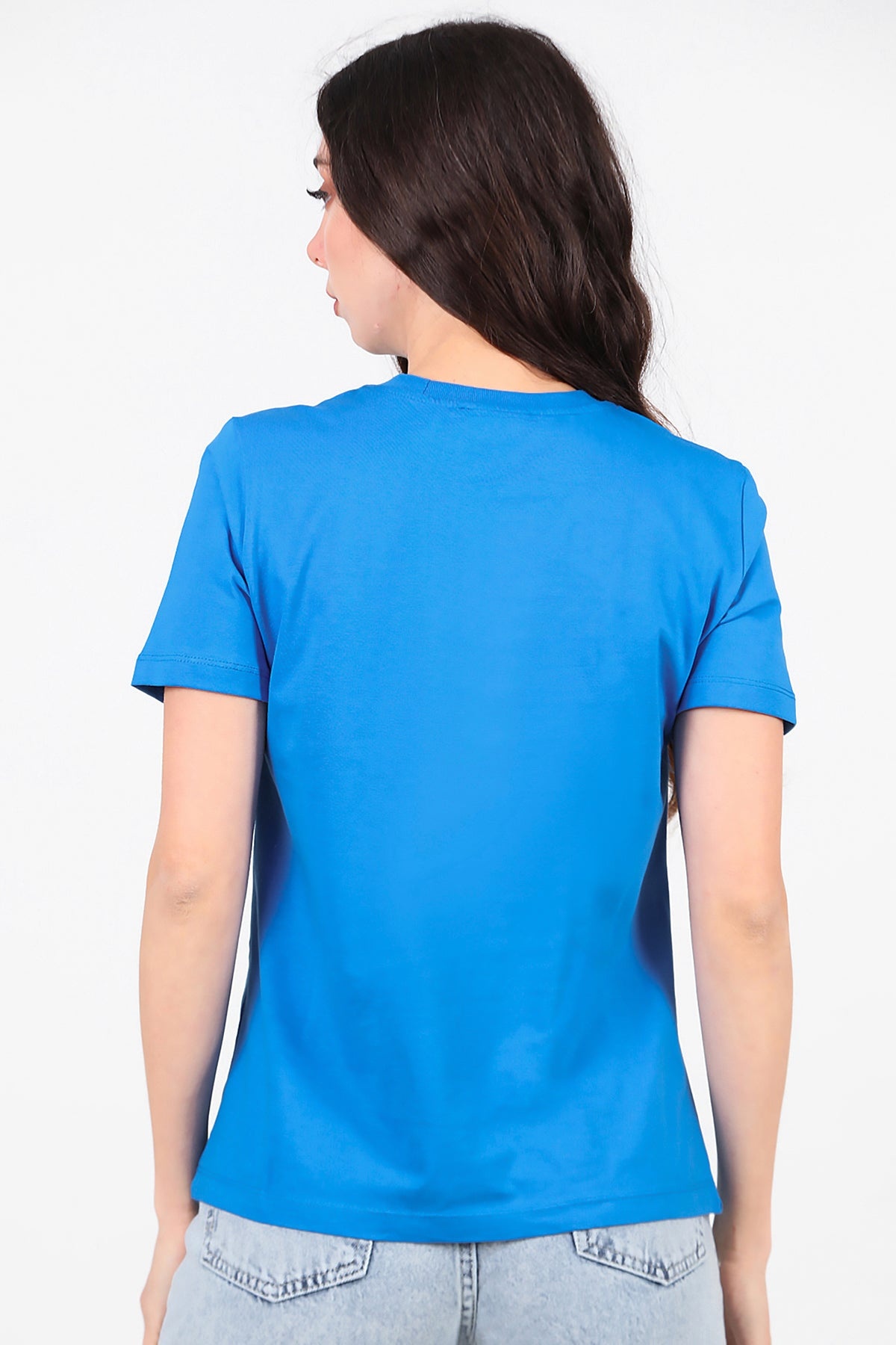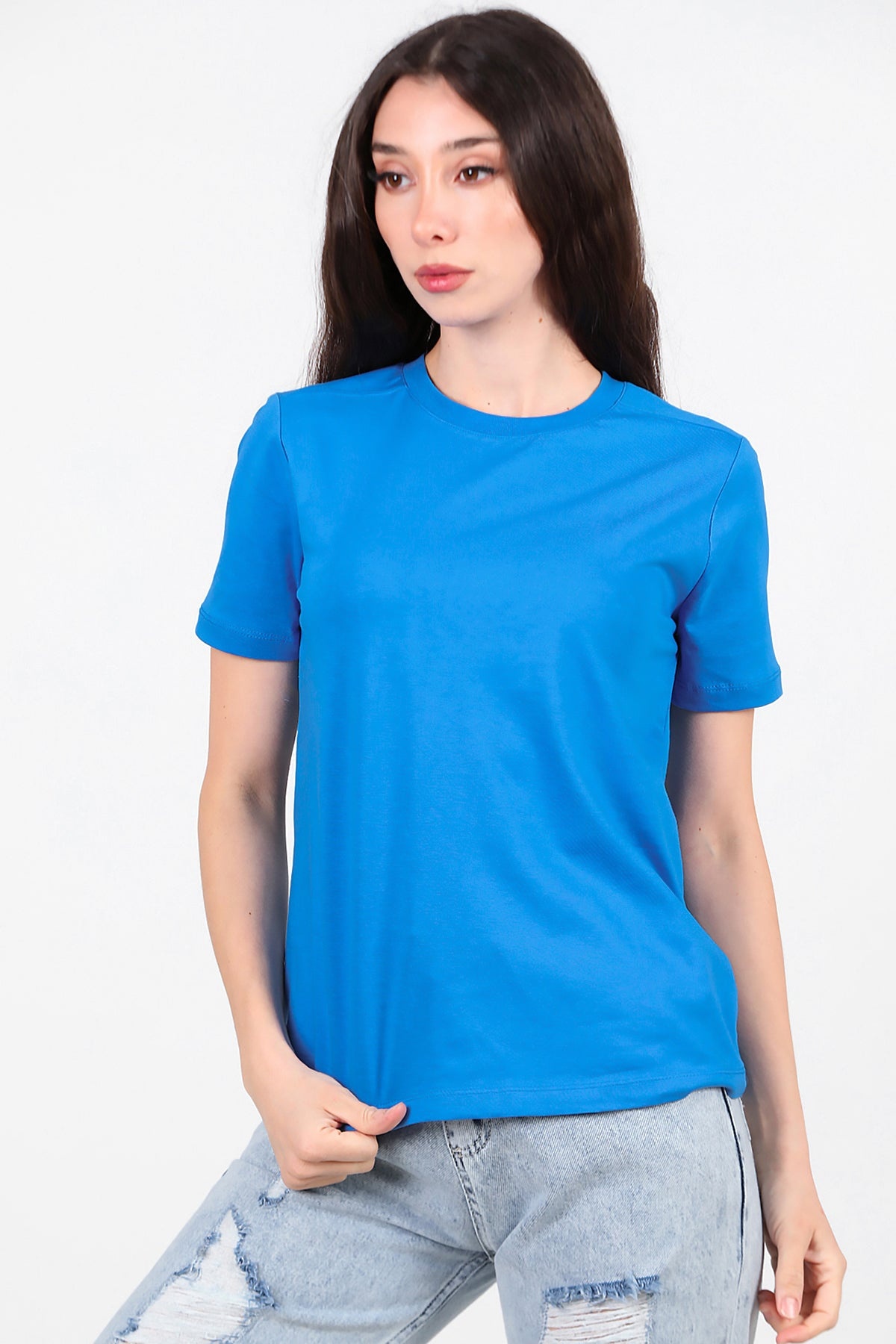Kadın Omzu Çimalı Basıc Tshırt Saks
