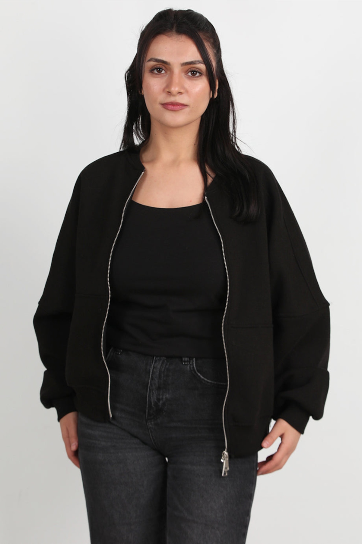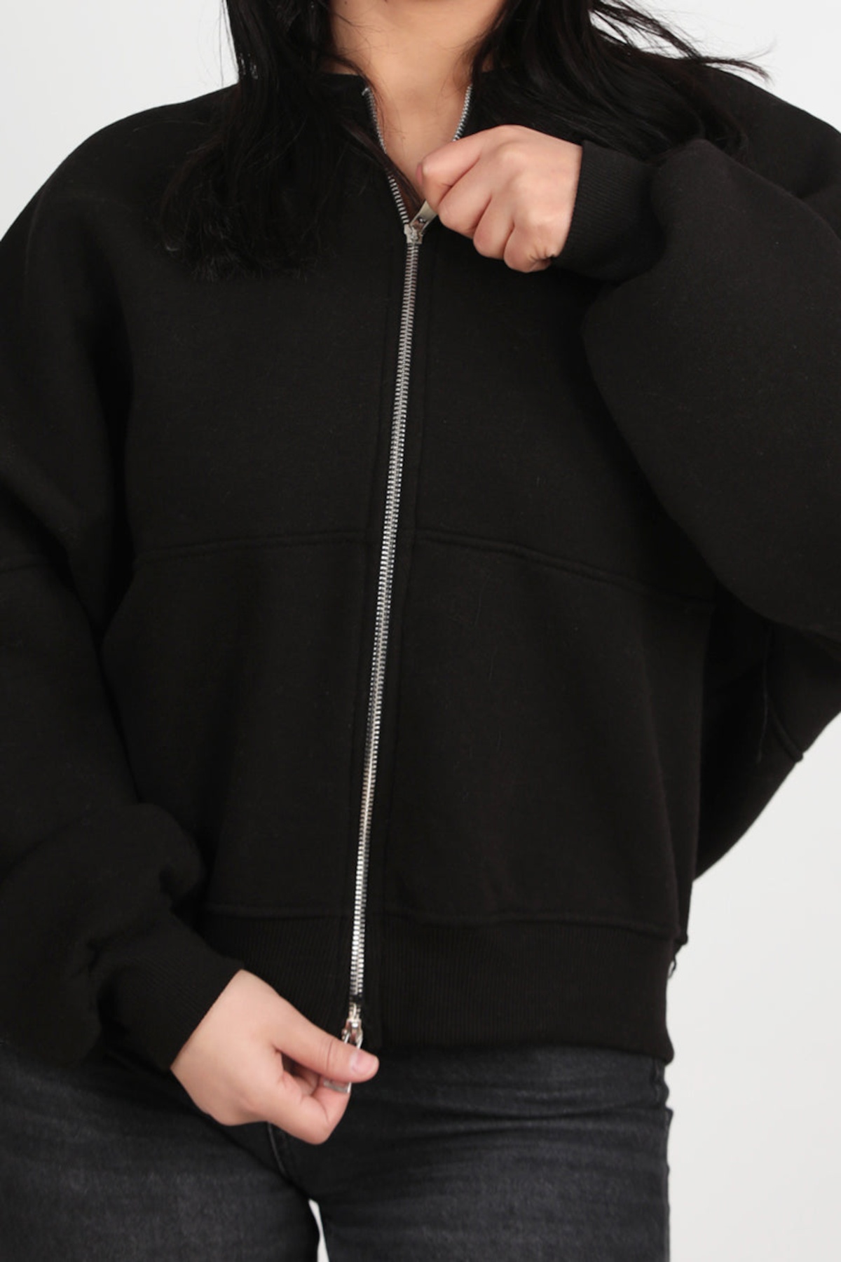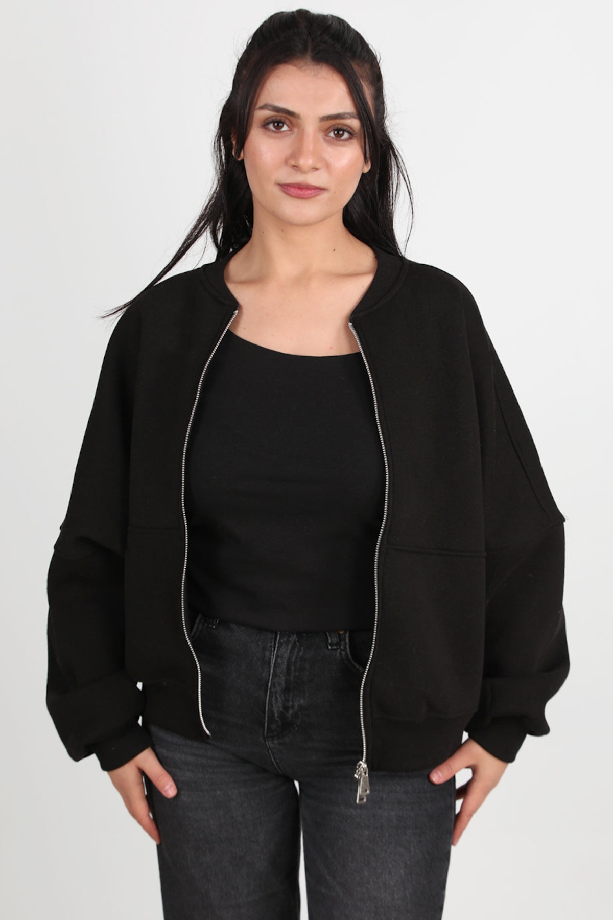 Kadın Önü Fermuarlı Parçalı Sweat Siyah