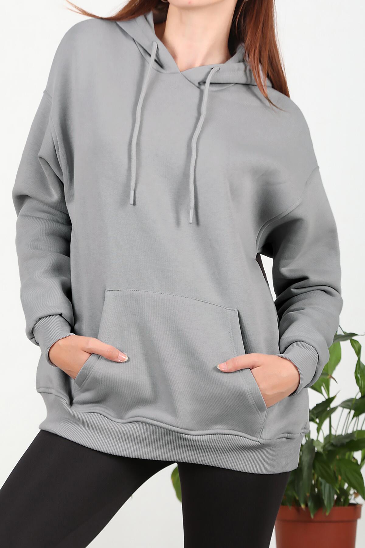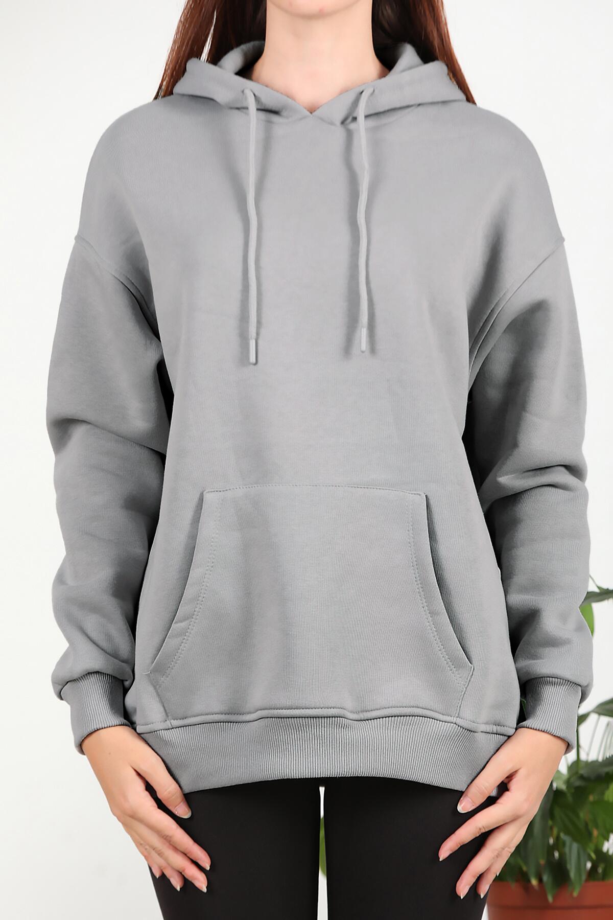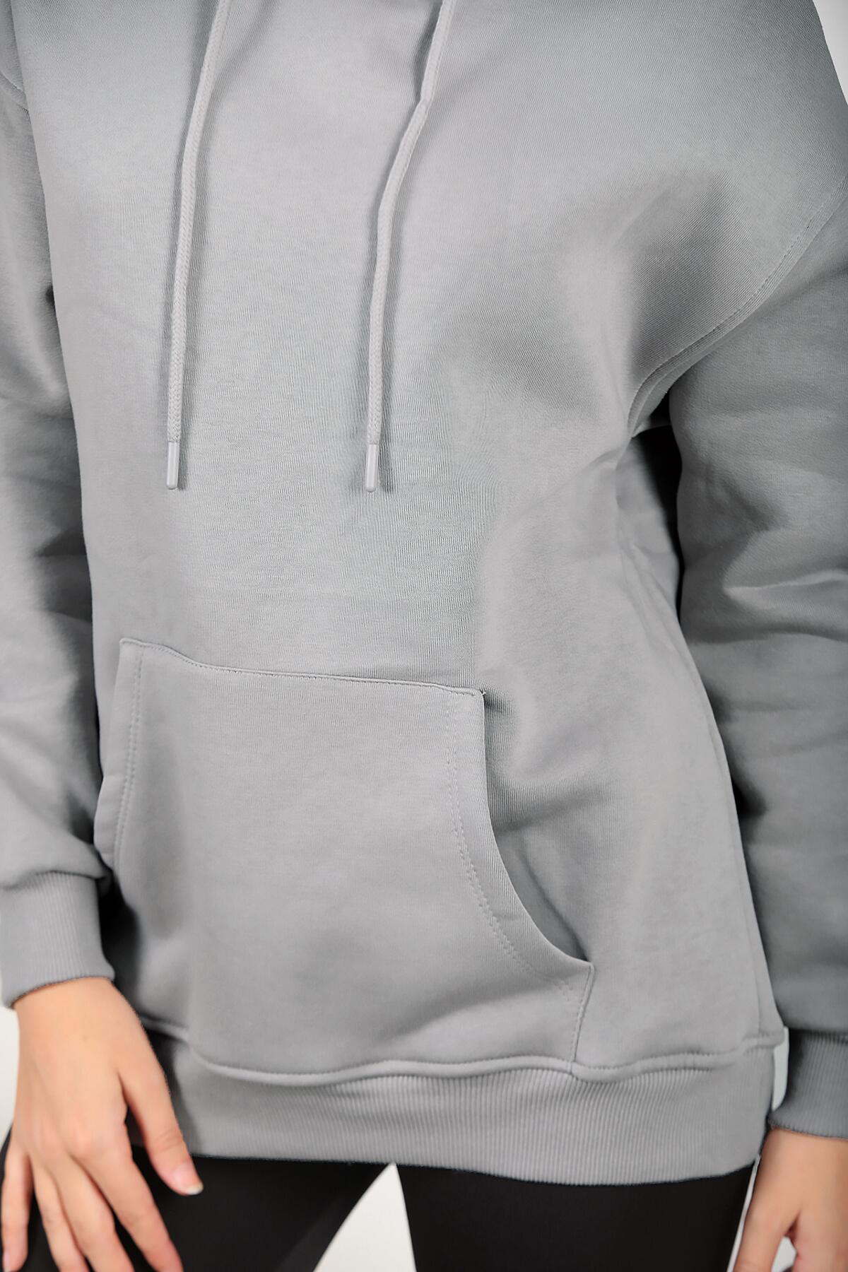 Kadın Üç İplik Kapşonlu Kanguru Cep Sweat Gri