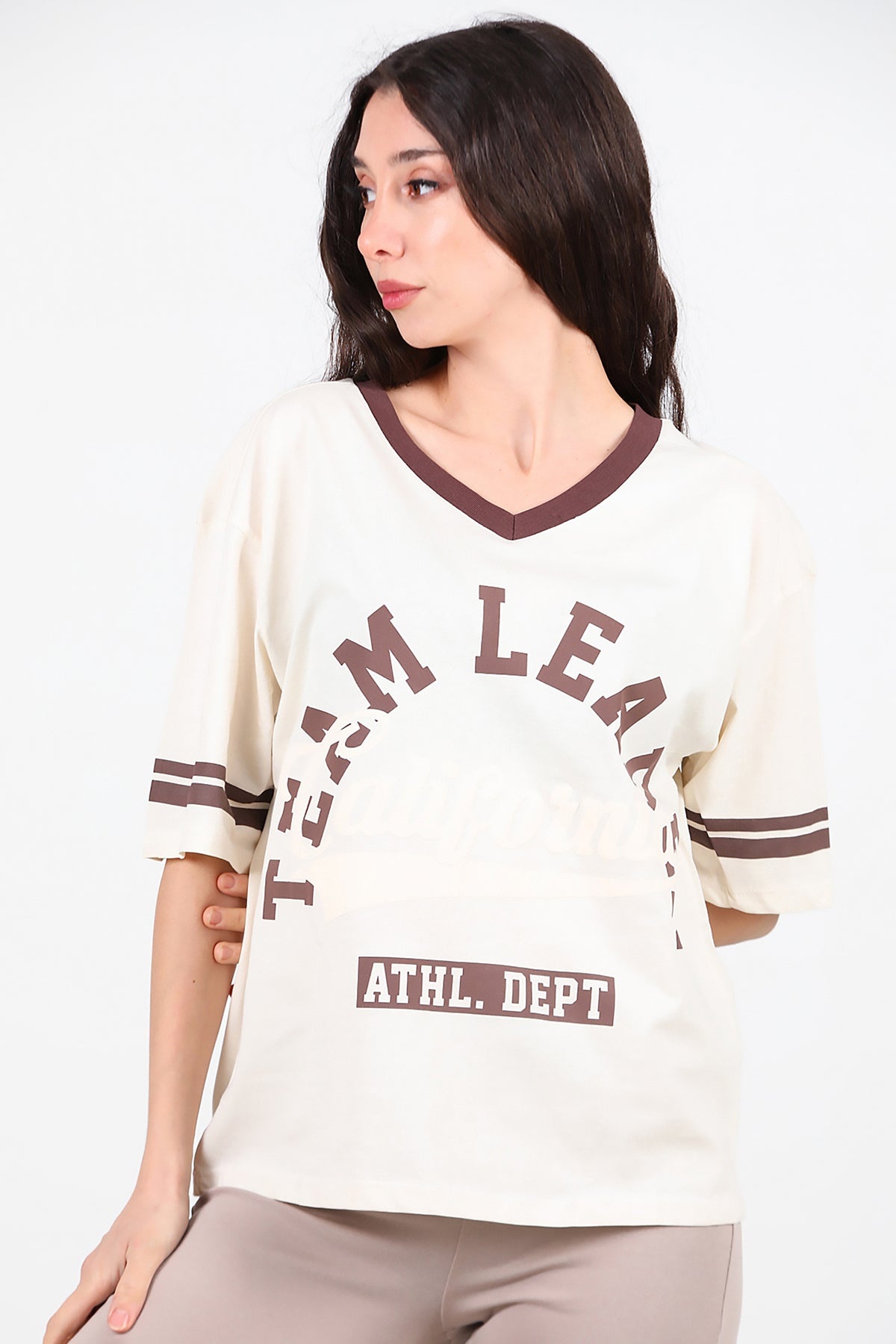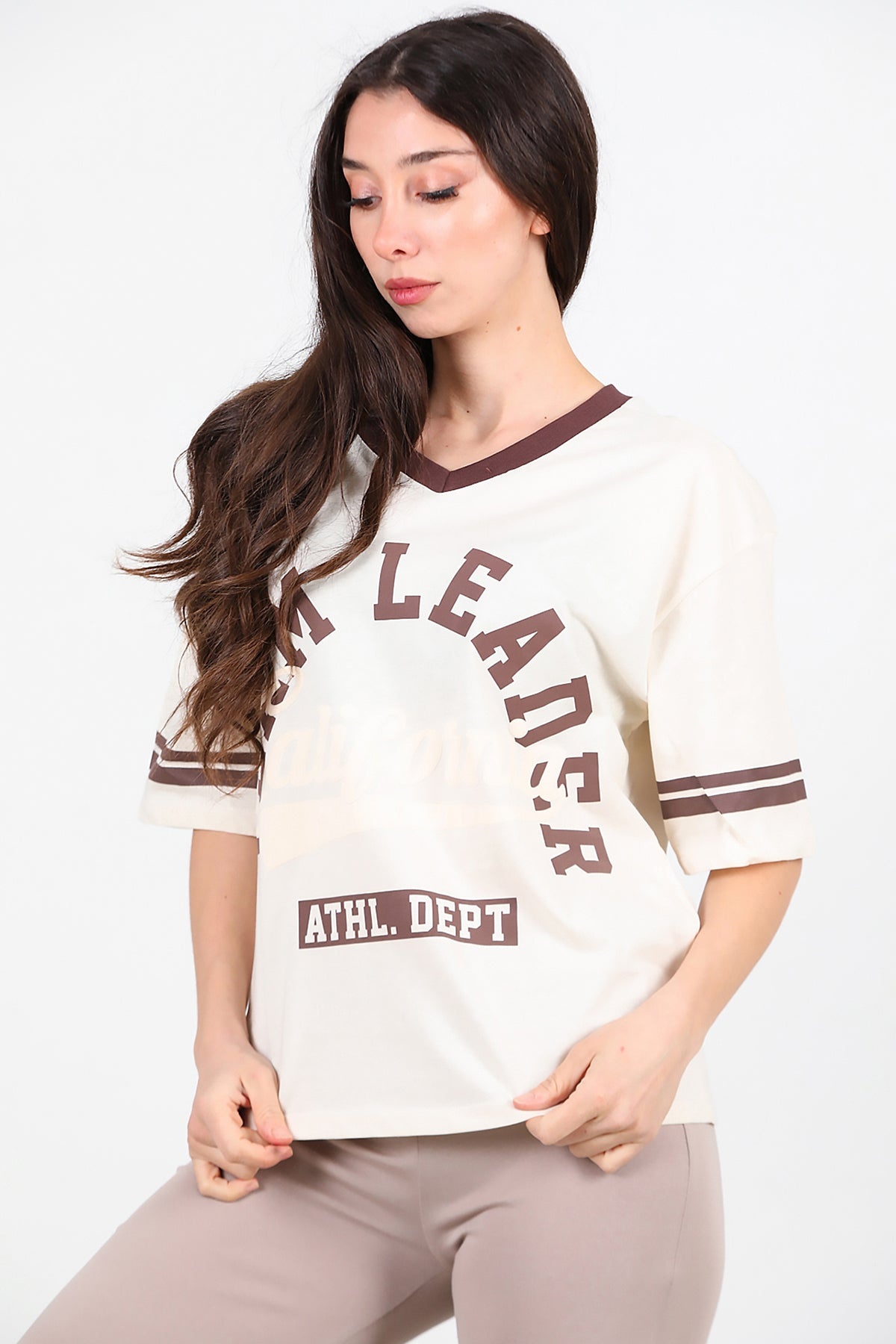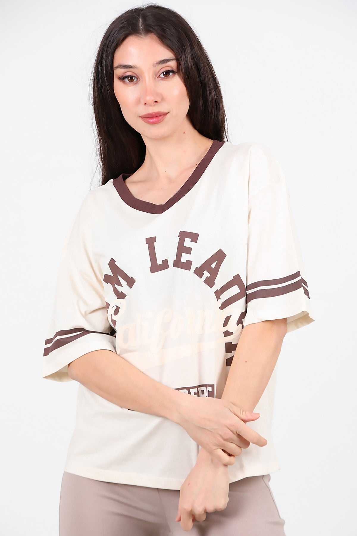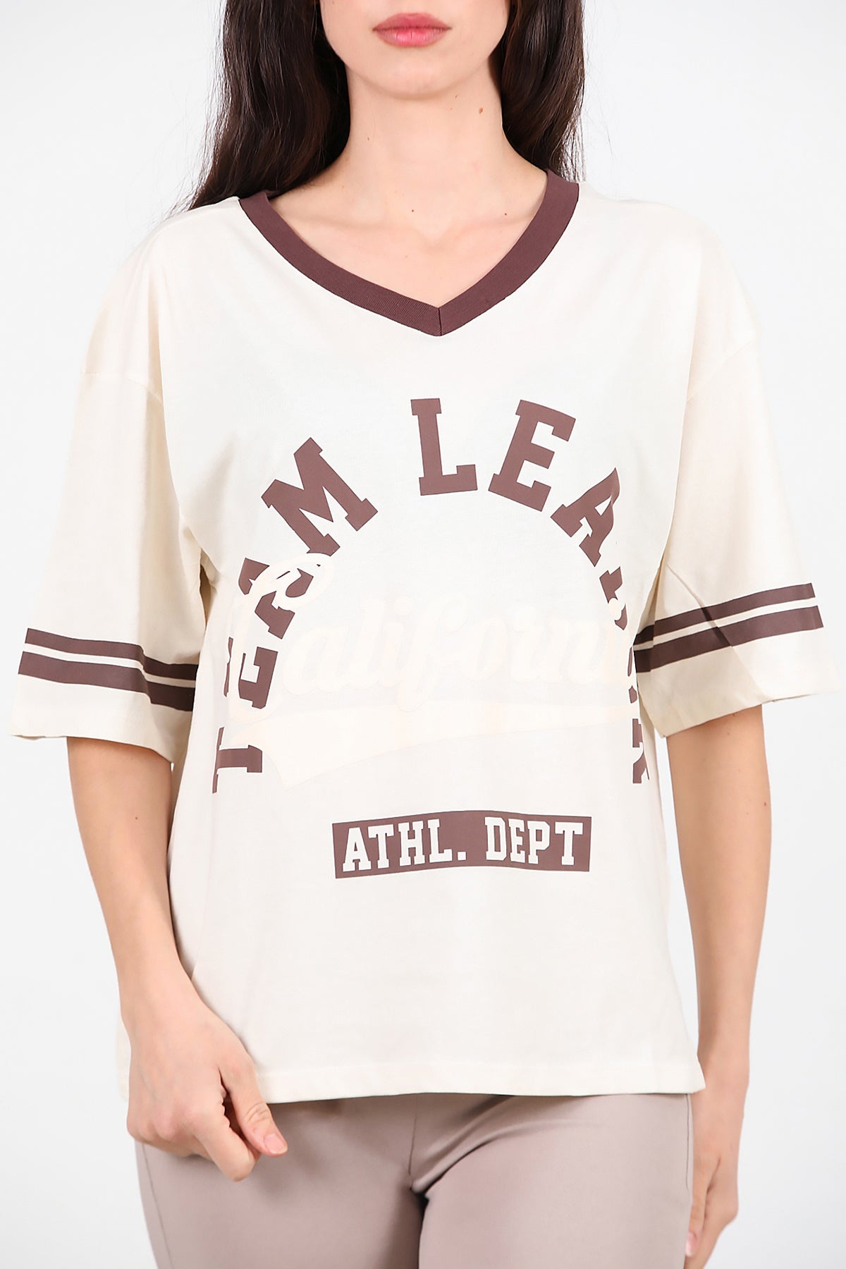 Kadın V Yaka Baskılı Tshırt Krem