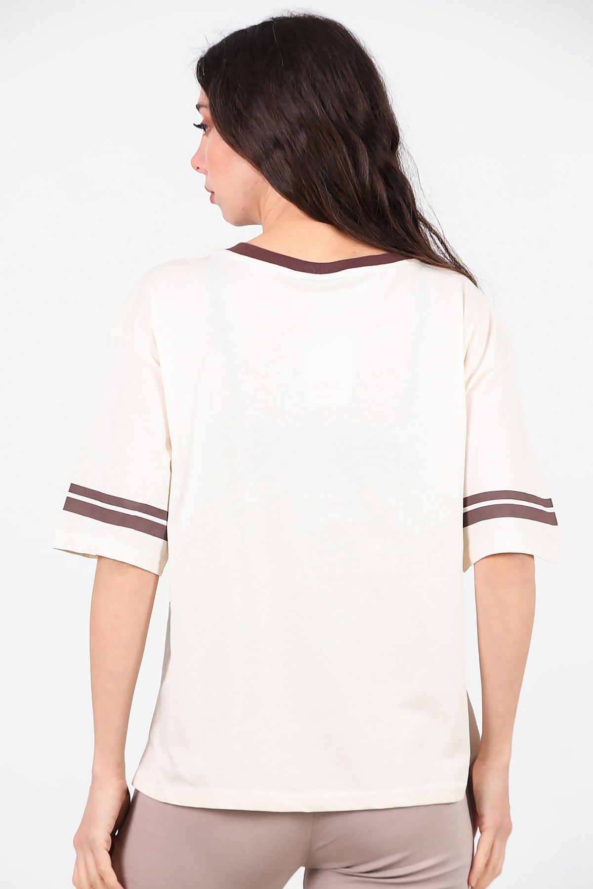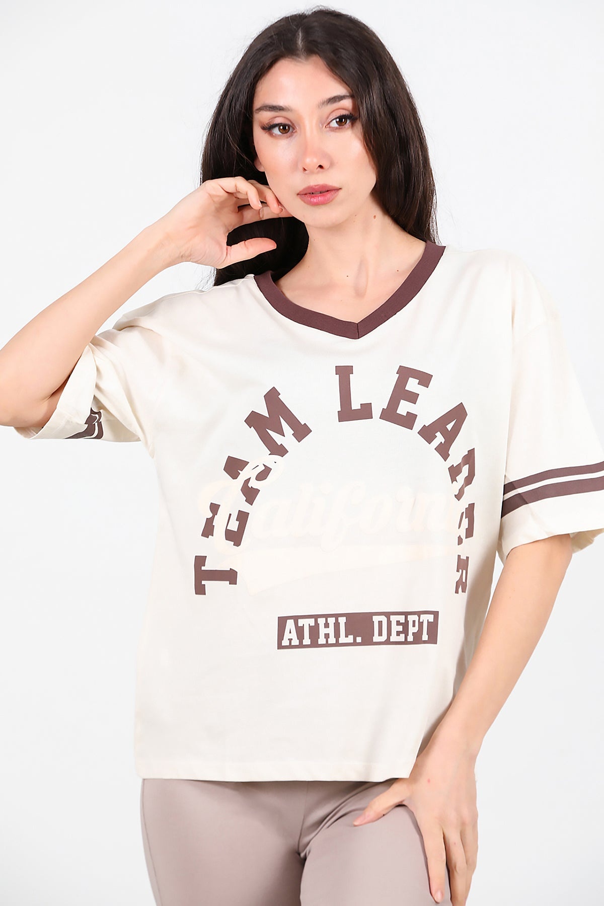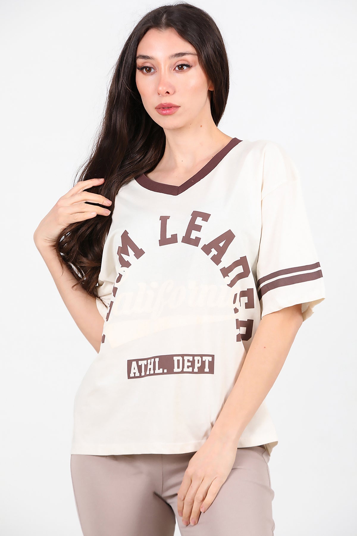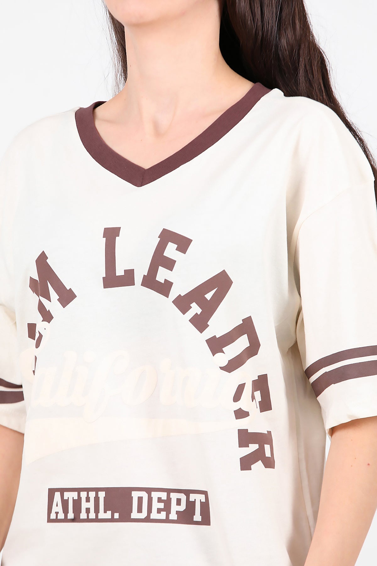 Kadın V Yaka Baskılı Tshırt Krem