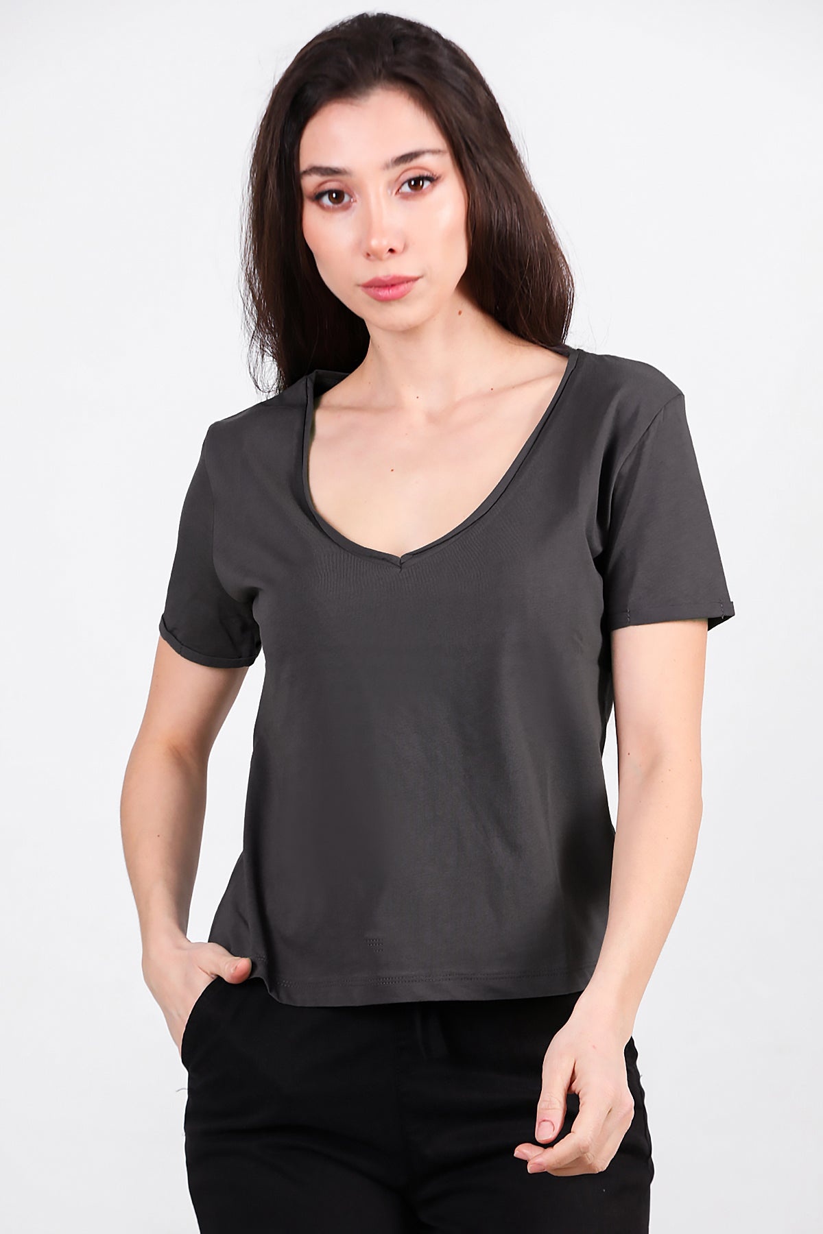 Numune Bedeni: 36Numune Boyu: 52 cmKumaş Tipi: %85 Pamuk %15 PolyesterKol: Kısa KolYaka: V Yaka