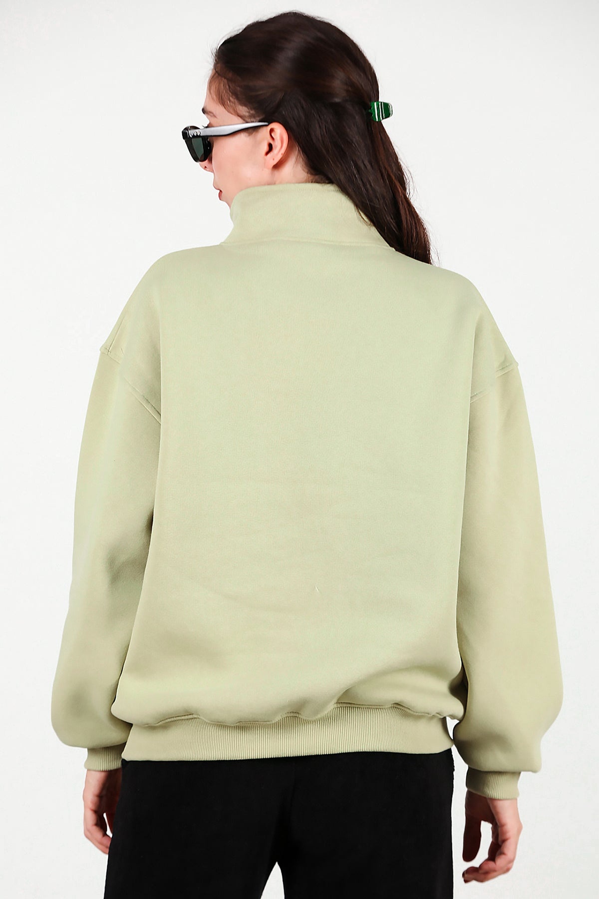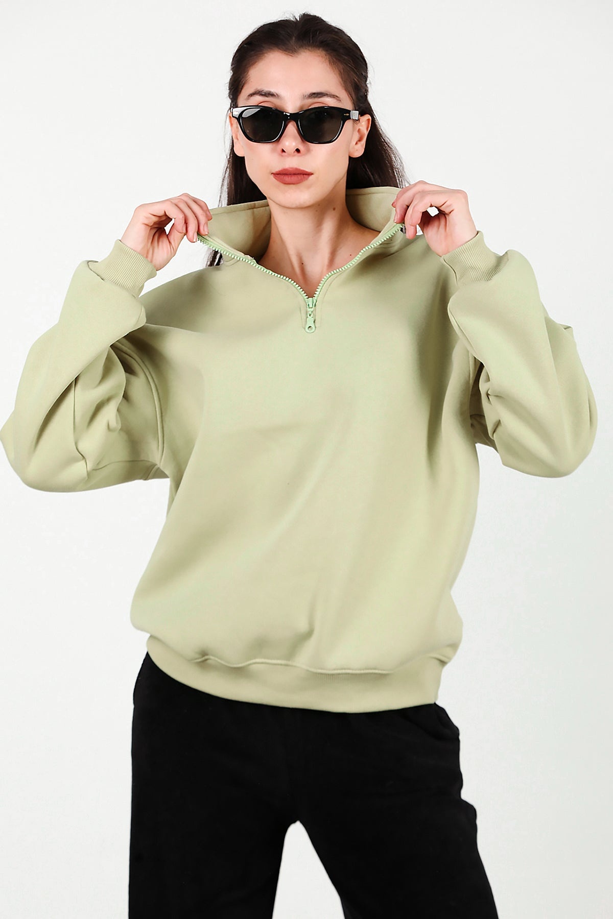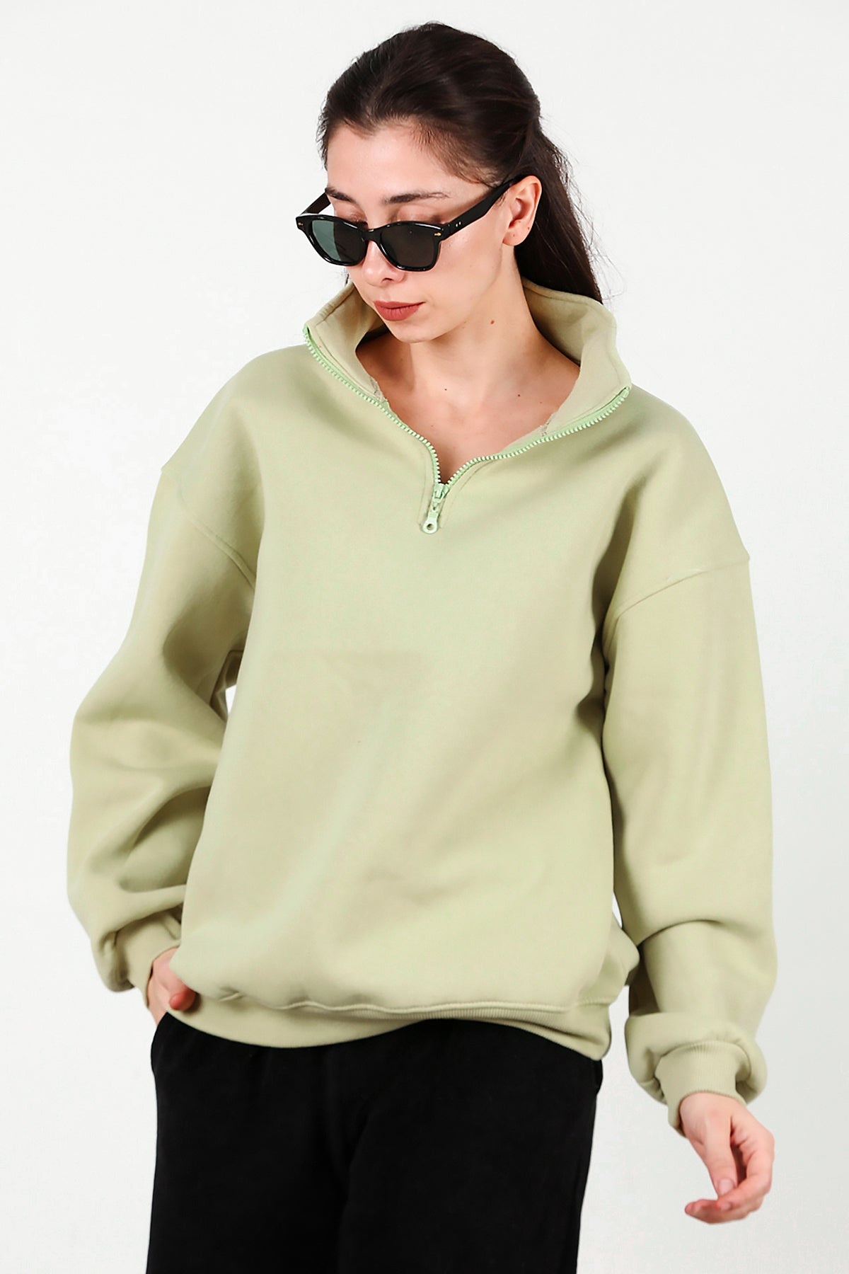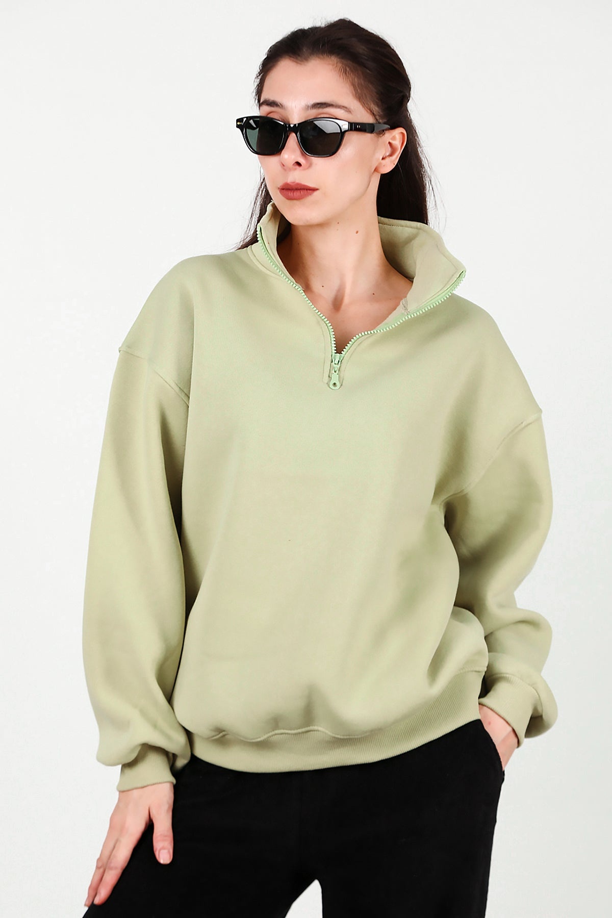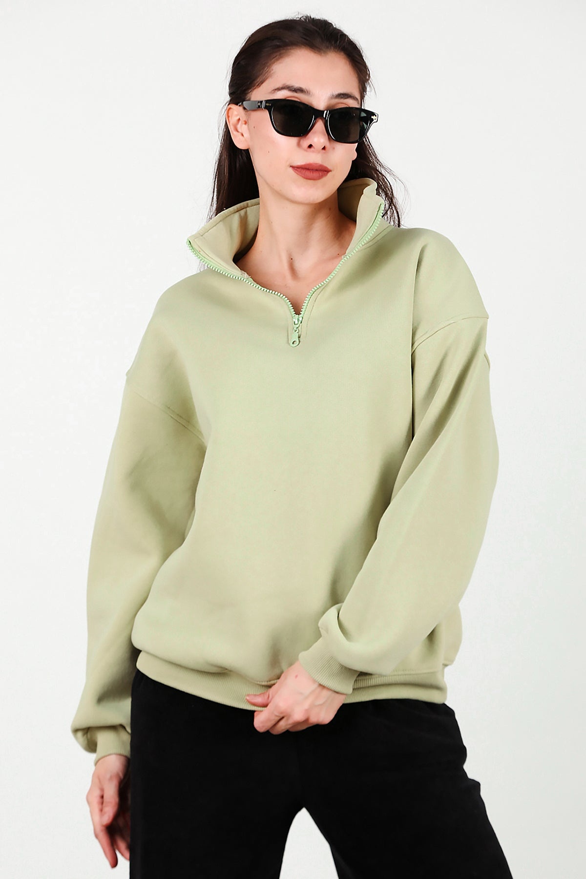 Kadın Yarım Balıkçı Yaka Fermuarlı Sweat Yeşil