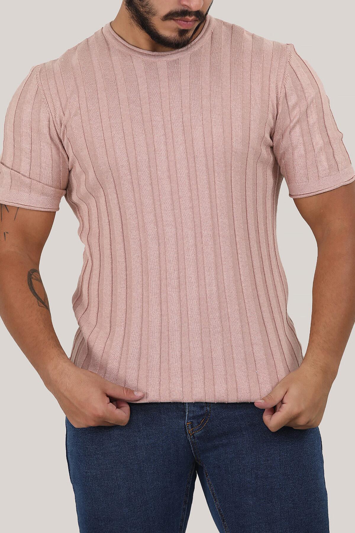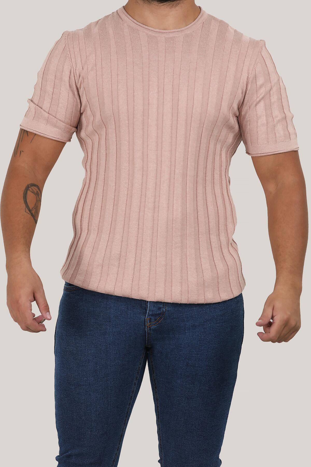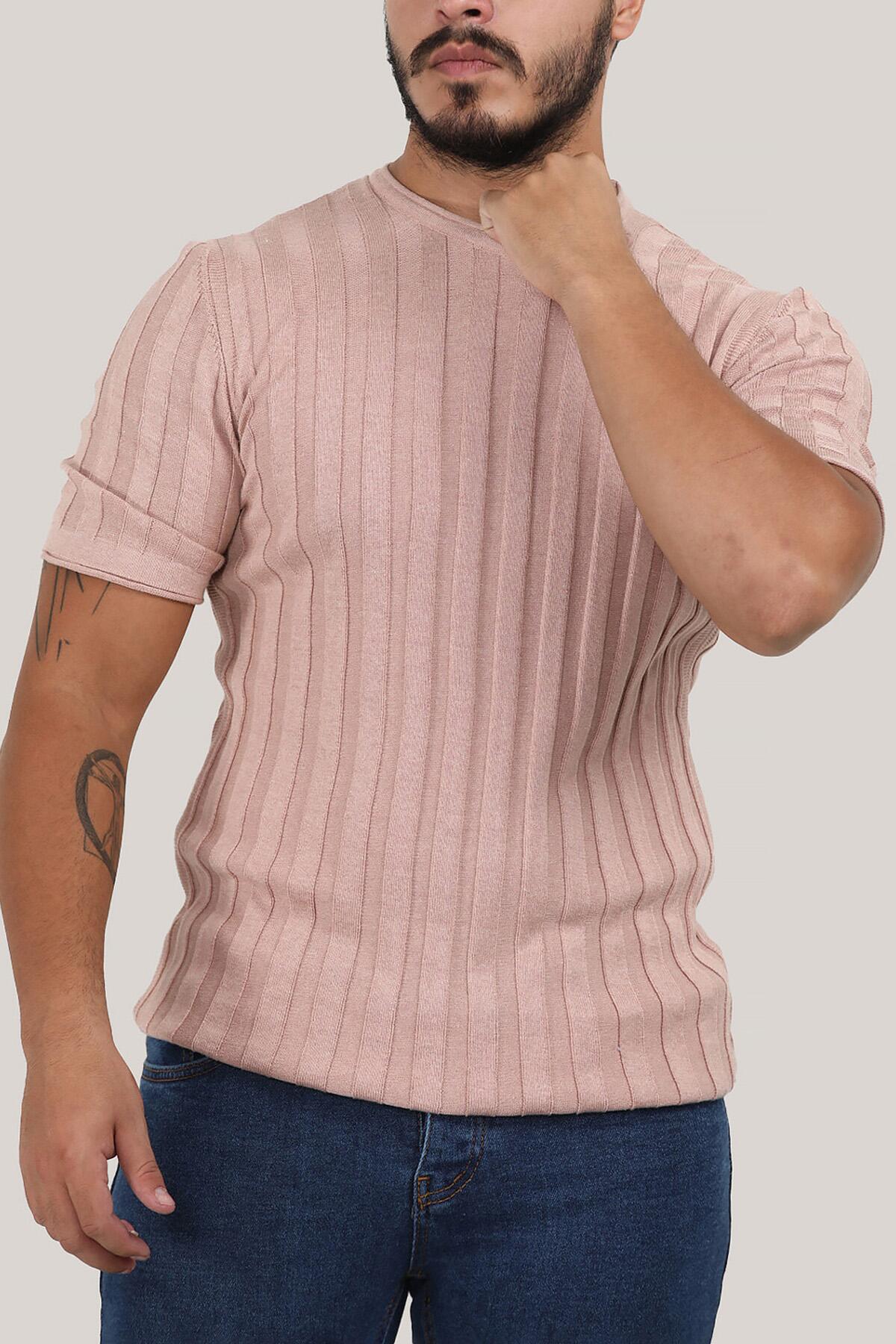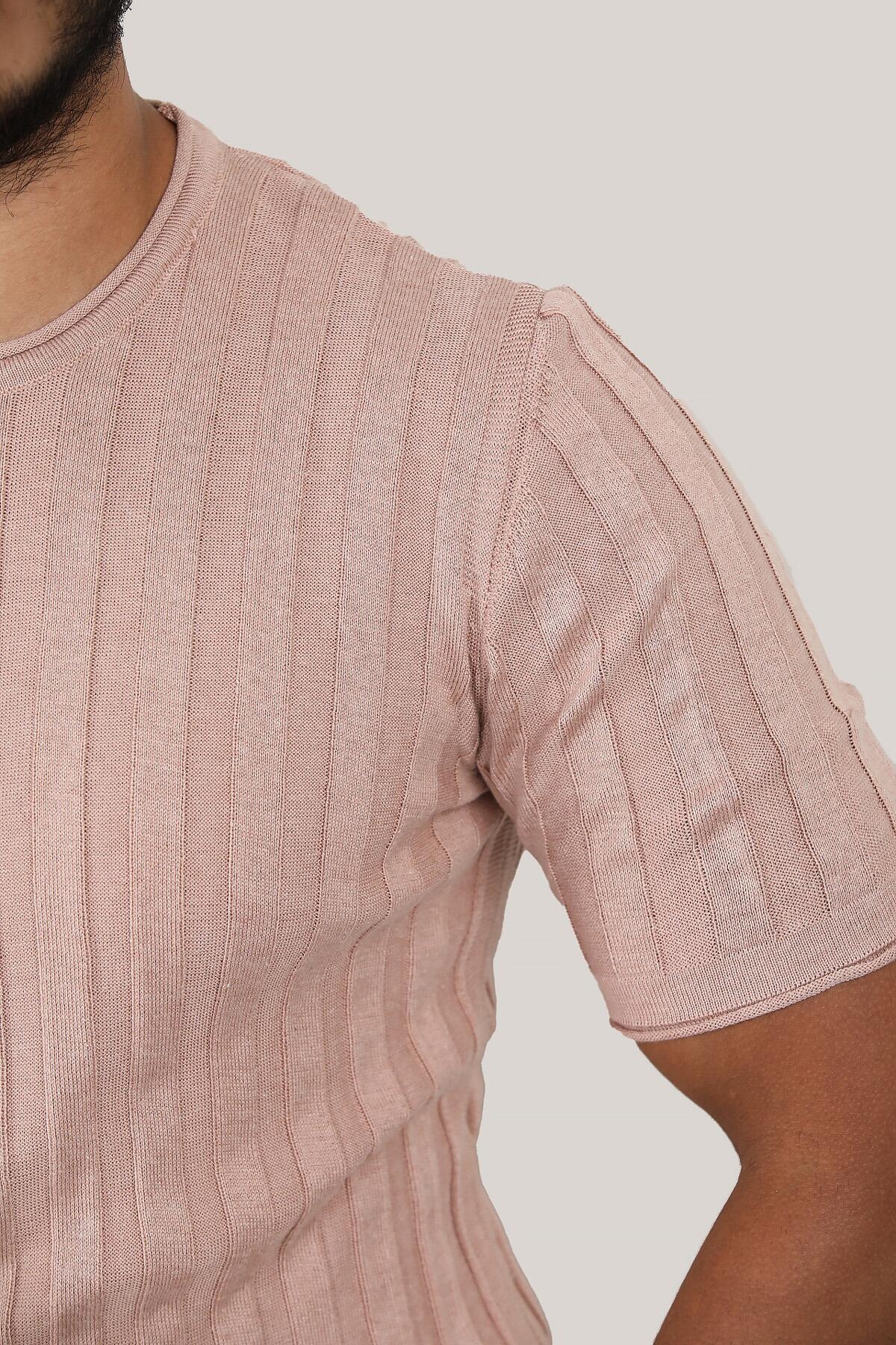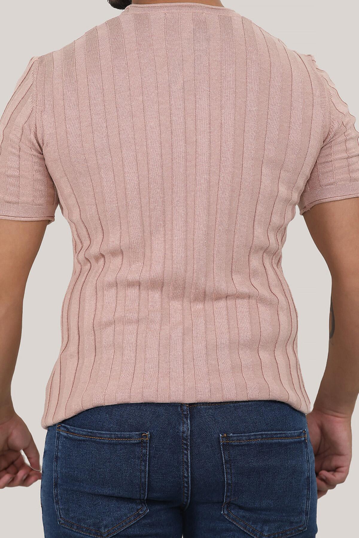 Erkek Bisiklet Yaka Kısa Kol Triko Pudra