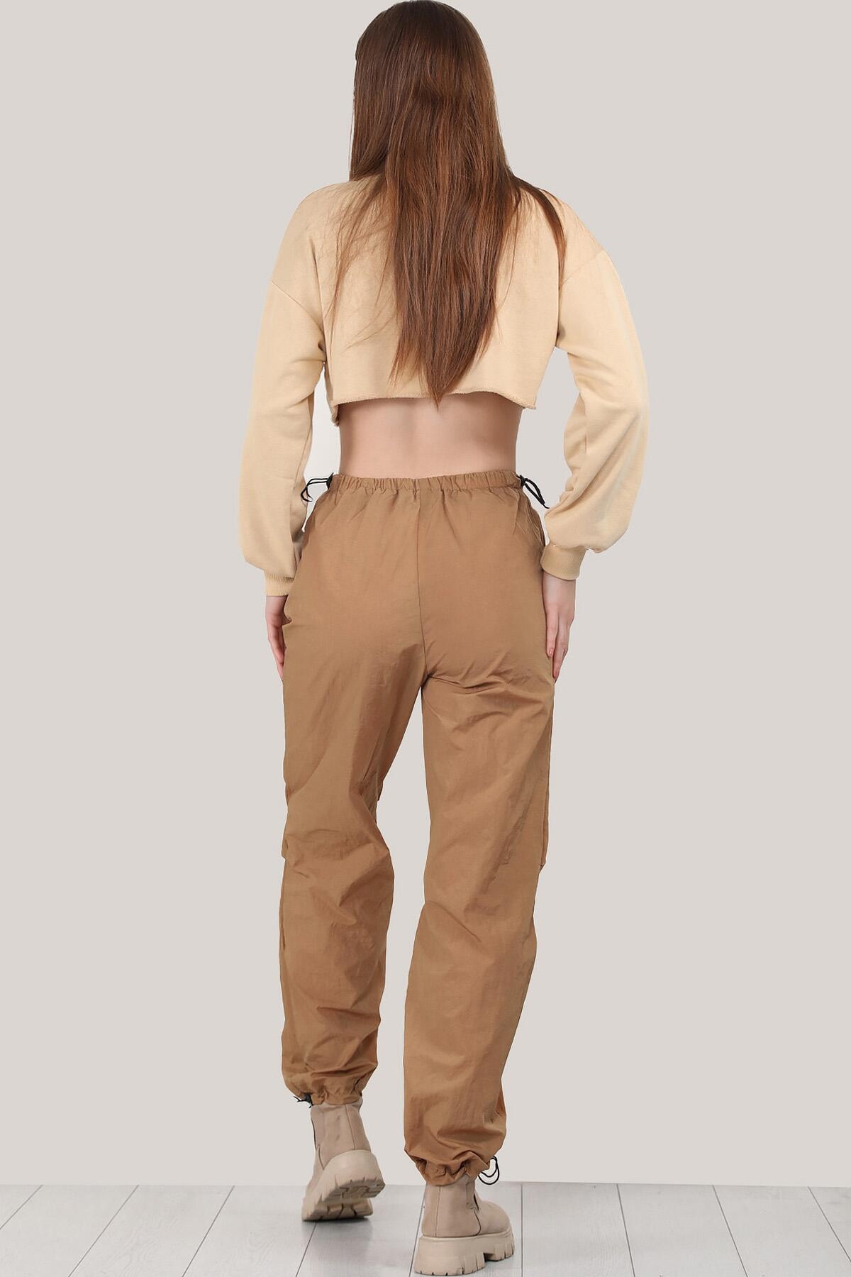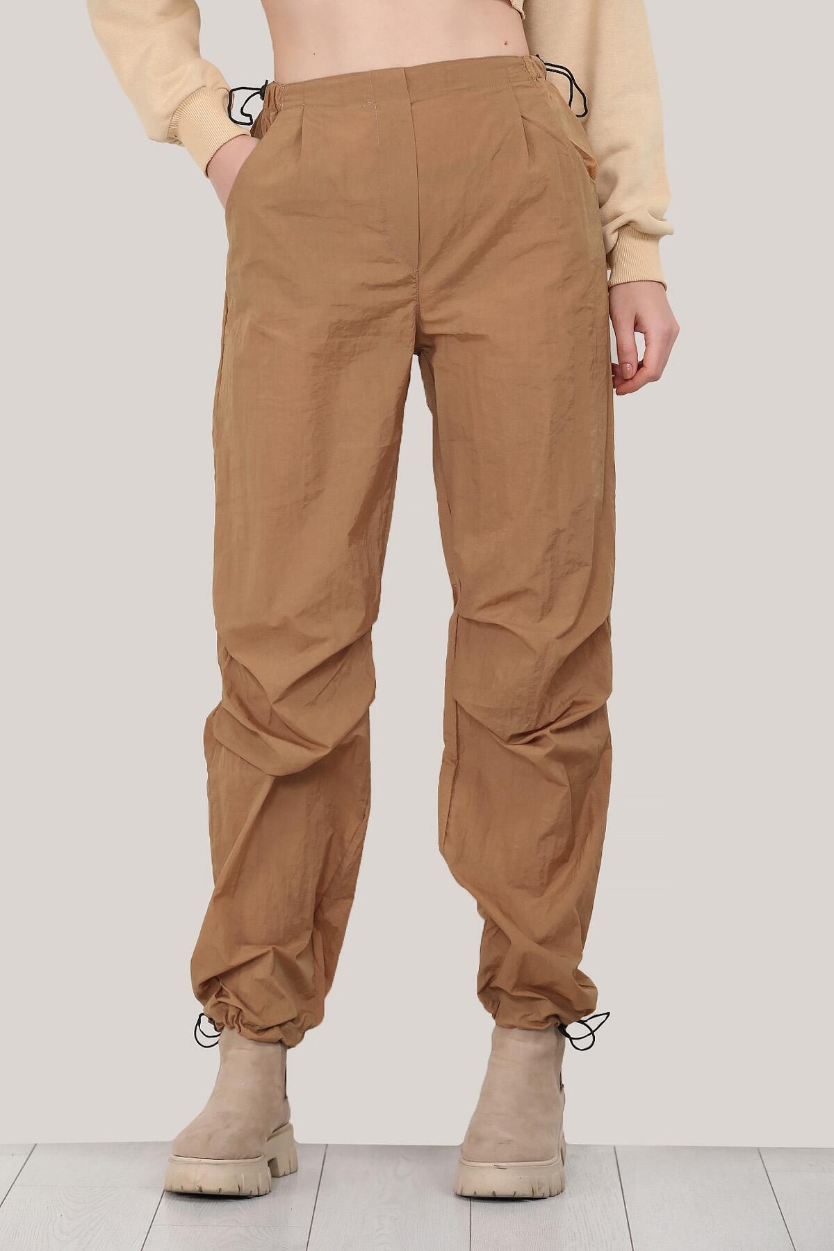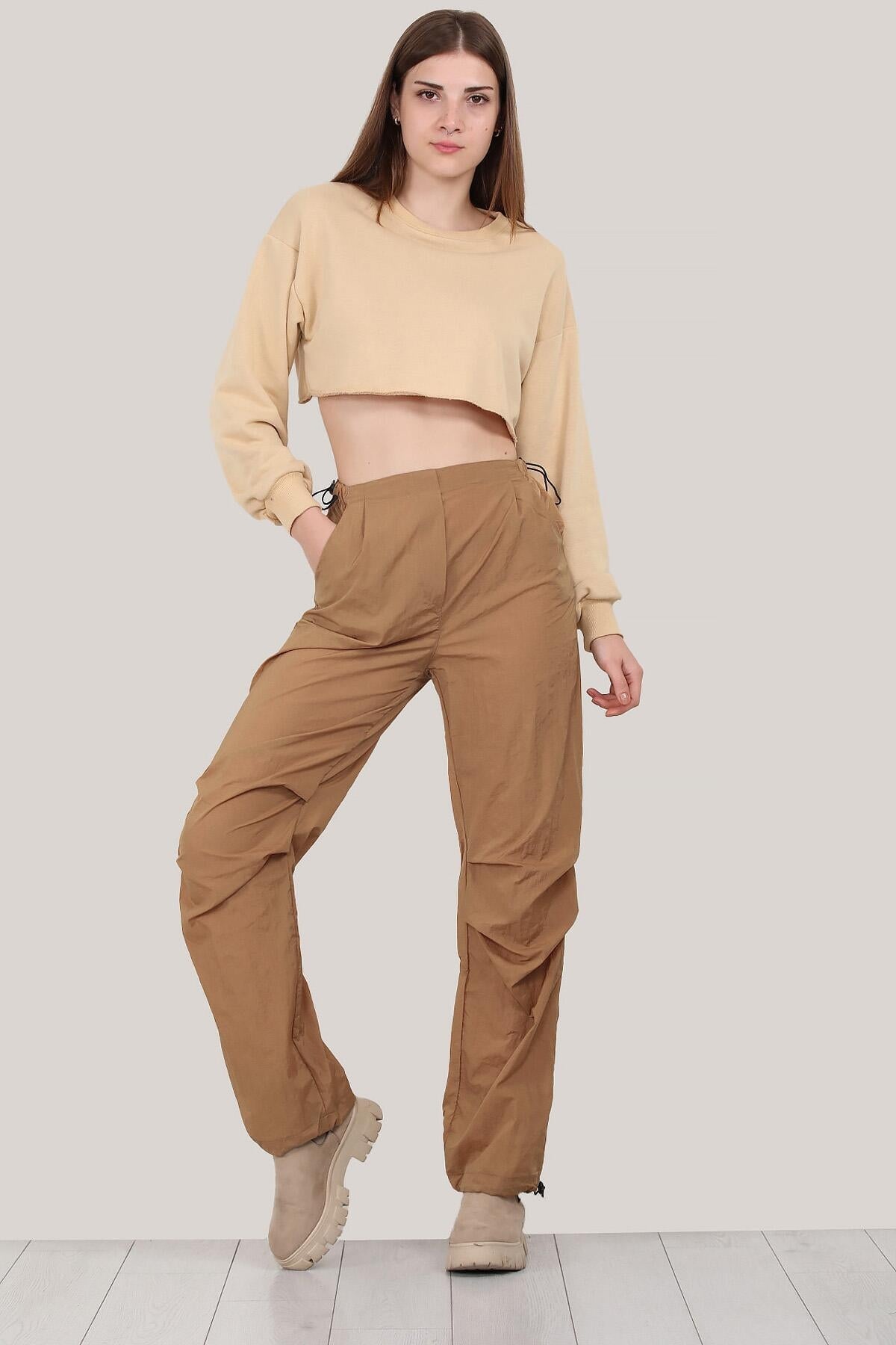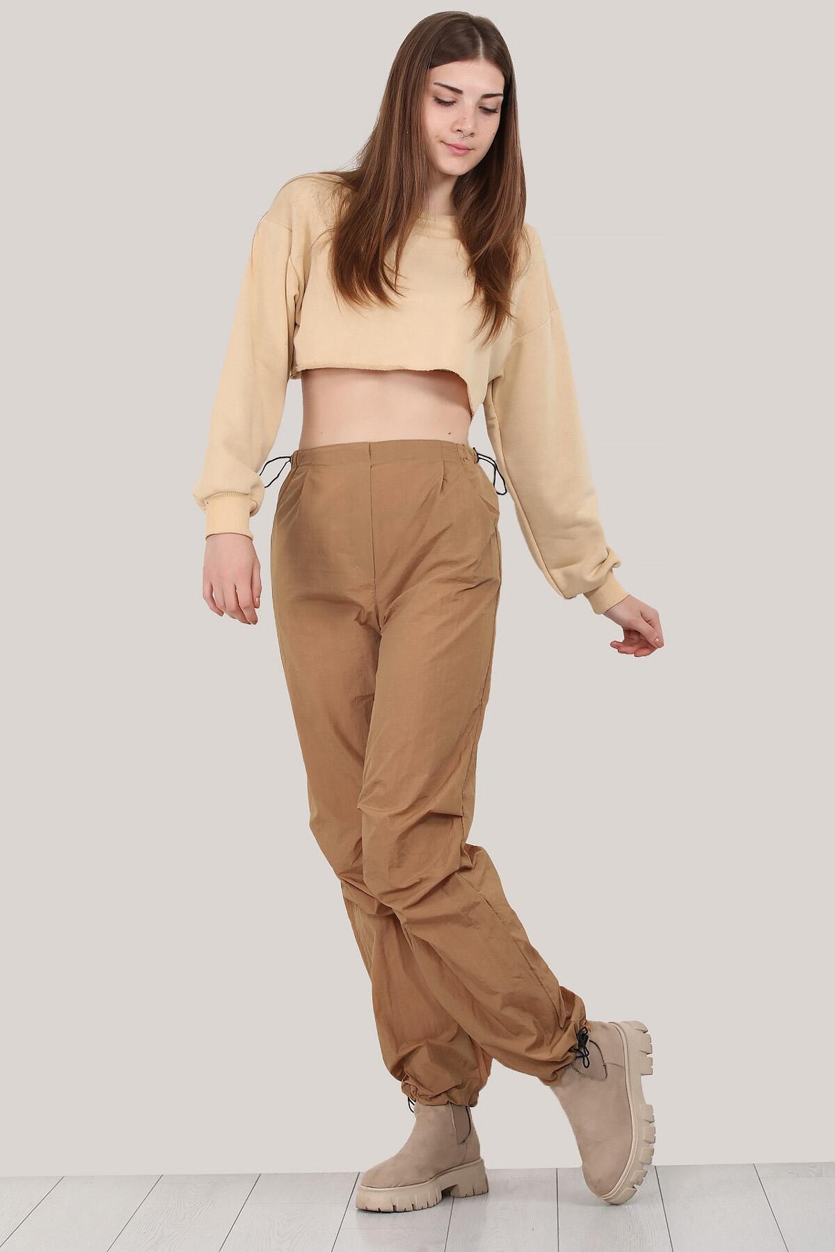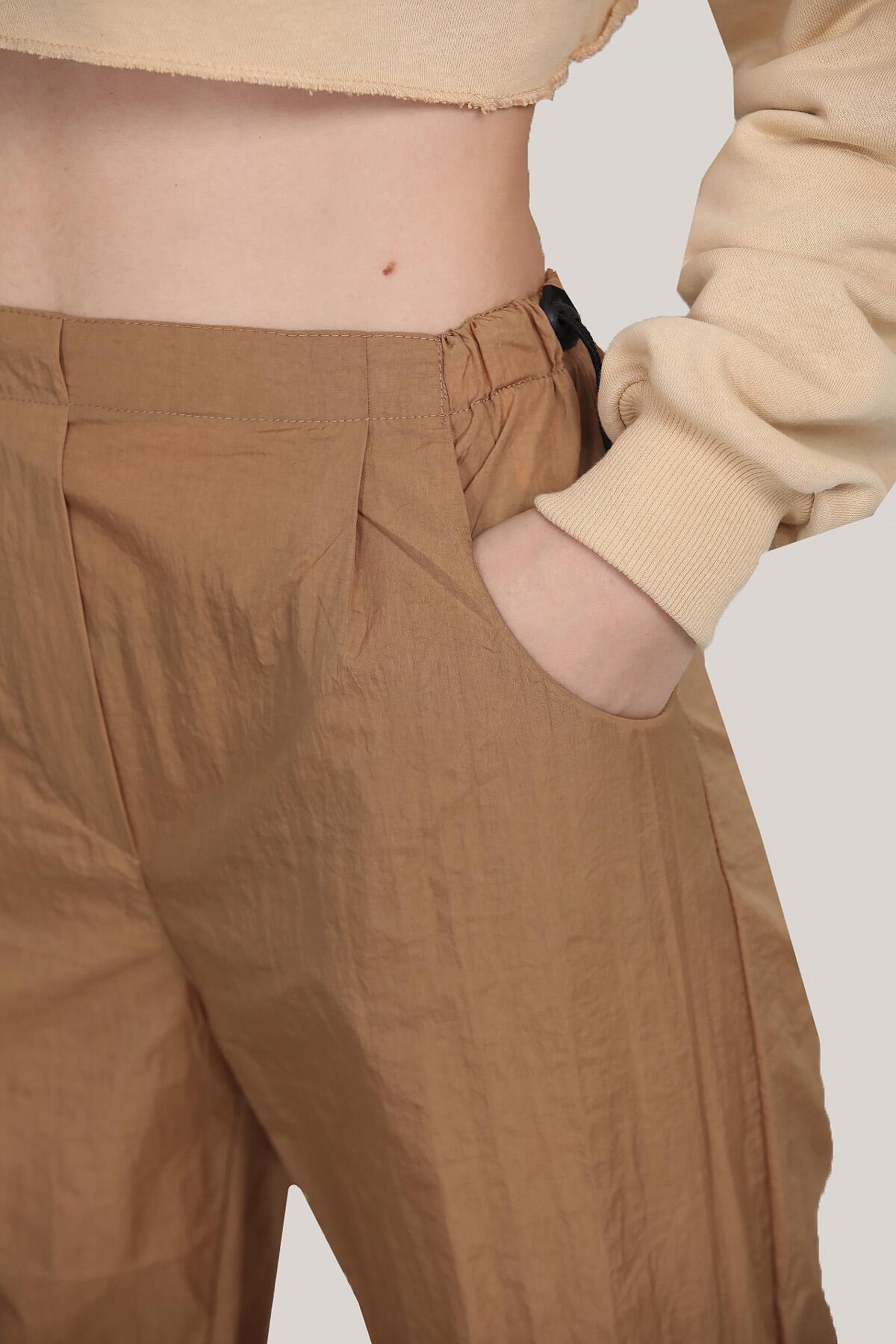 Numune Bedeni: 36 Numune Boyu: 107 cm Kumaş Tipi: %100 Polyester Bel ve Paça: Lastikli Paça: Boru Paça Bel: Yüksek Bel Kumaş Türü: Paraşüt Kumaş