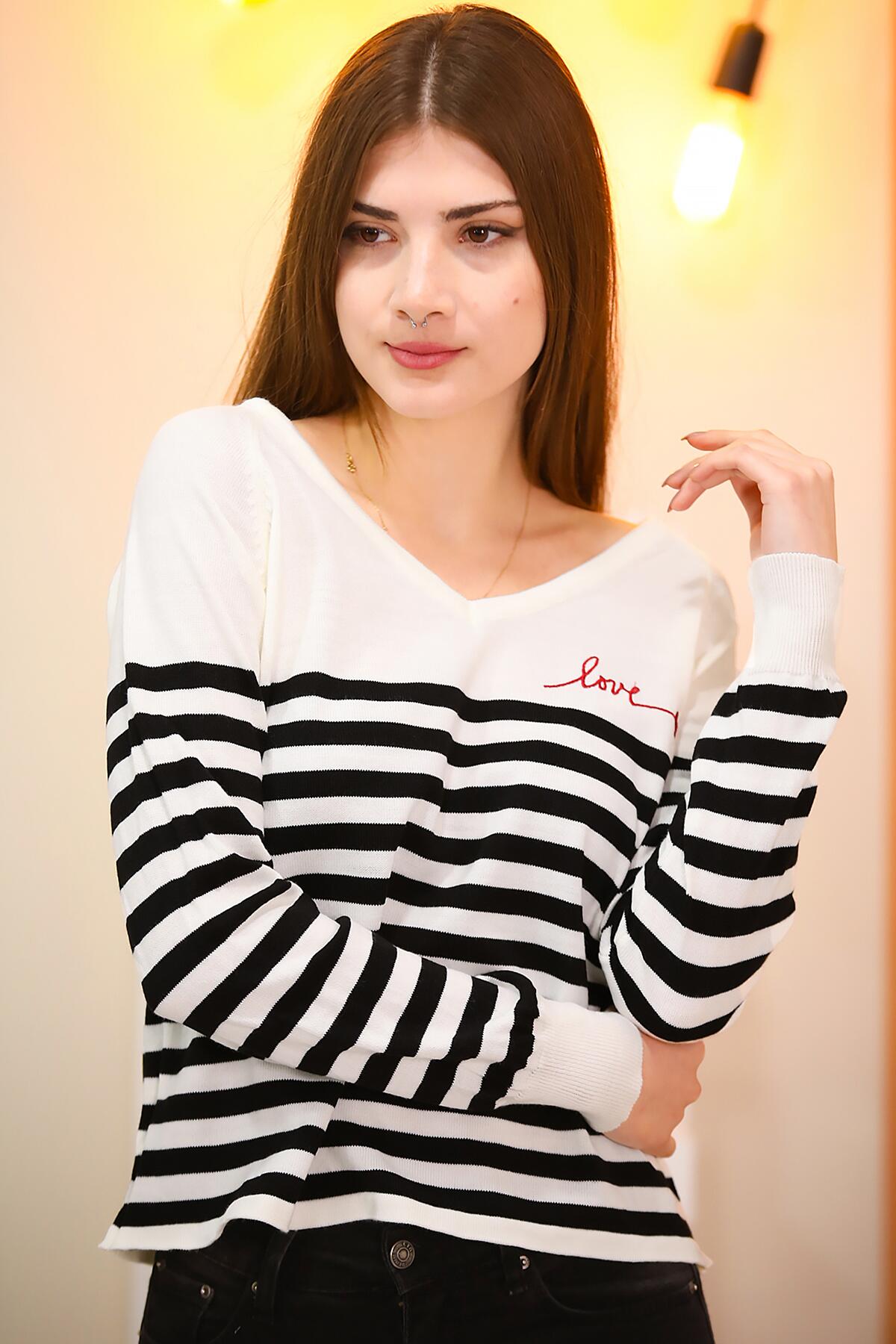 Numune Bedeni: SB (Standart Beden) Numune Boyu: 56 Cm Kumaş Tipi: %100 Akrilik Kol: Uzun KolKumaş Türü: Triko Ürün Özelliği: V Yaka, Çizgili