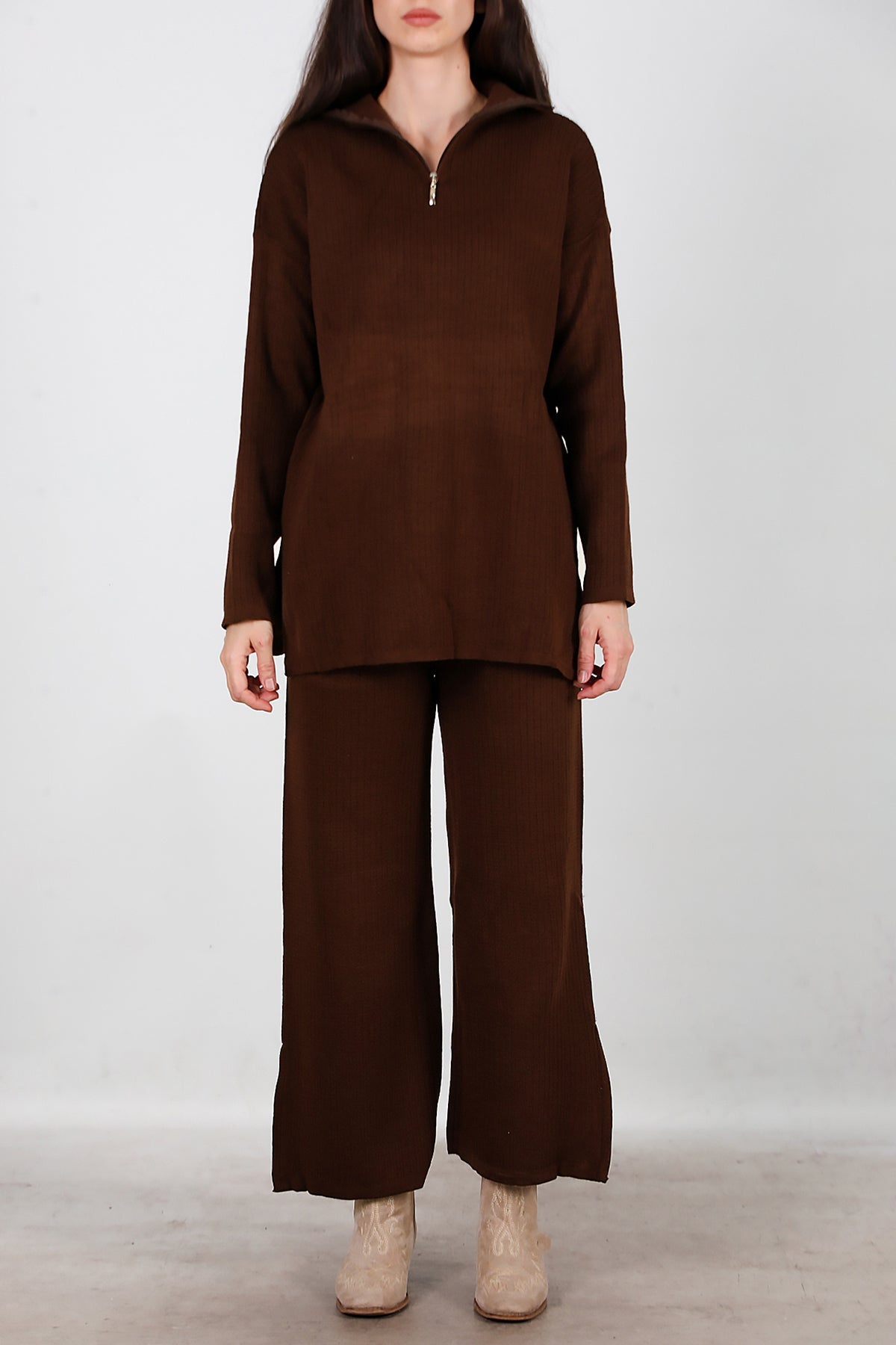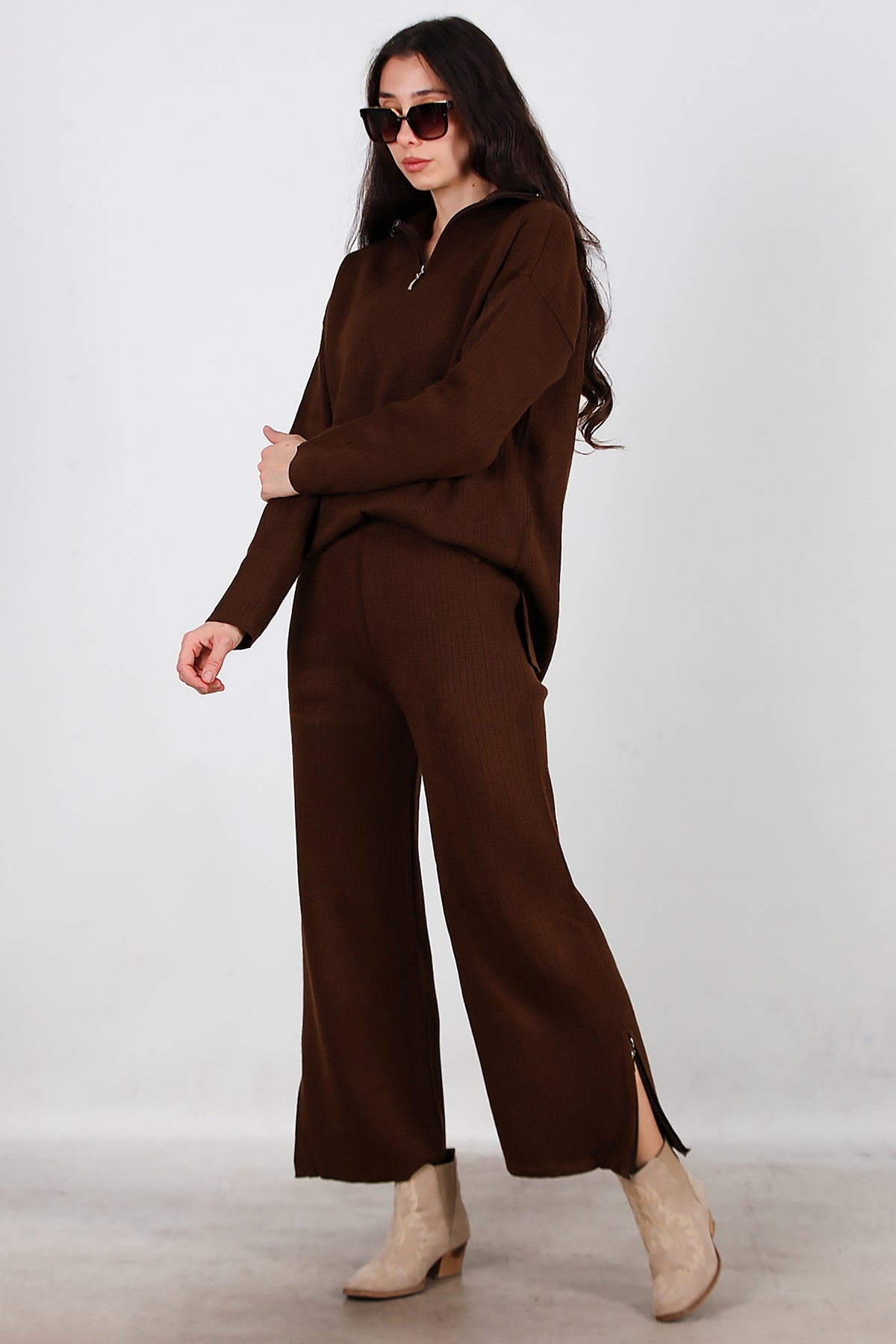 Kadın Fermuar Detay Triko Takım Kahverengi