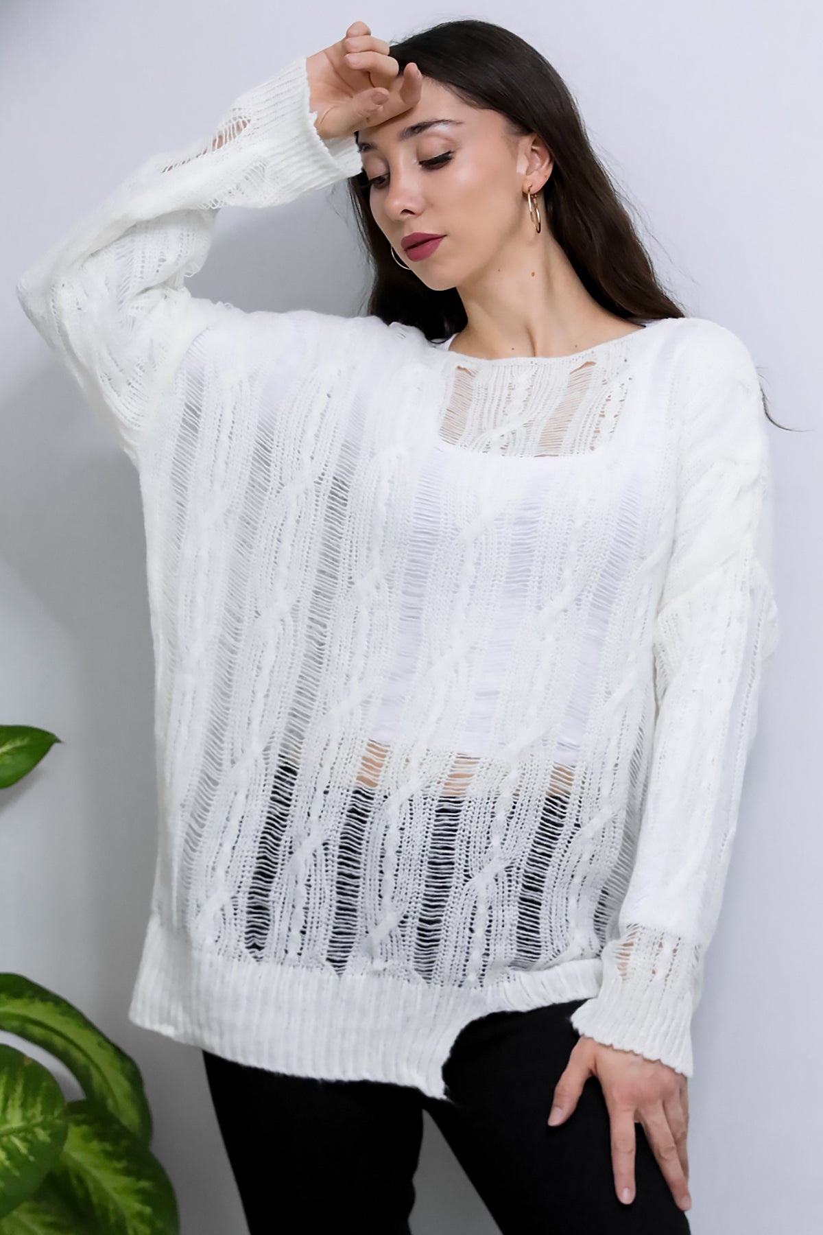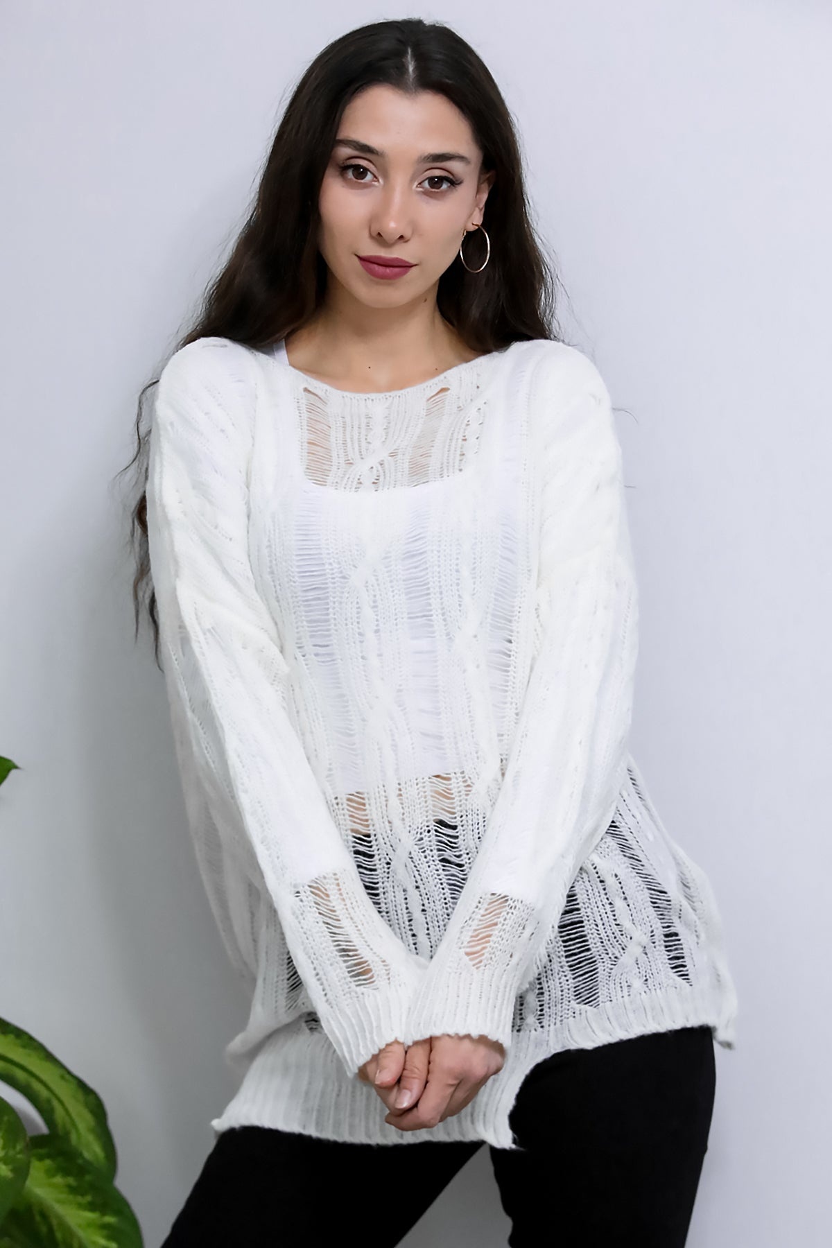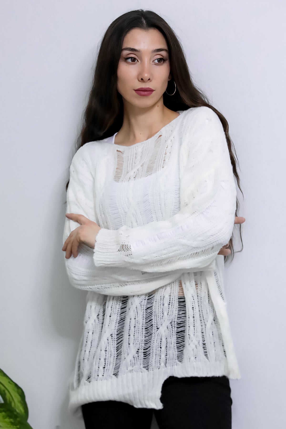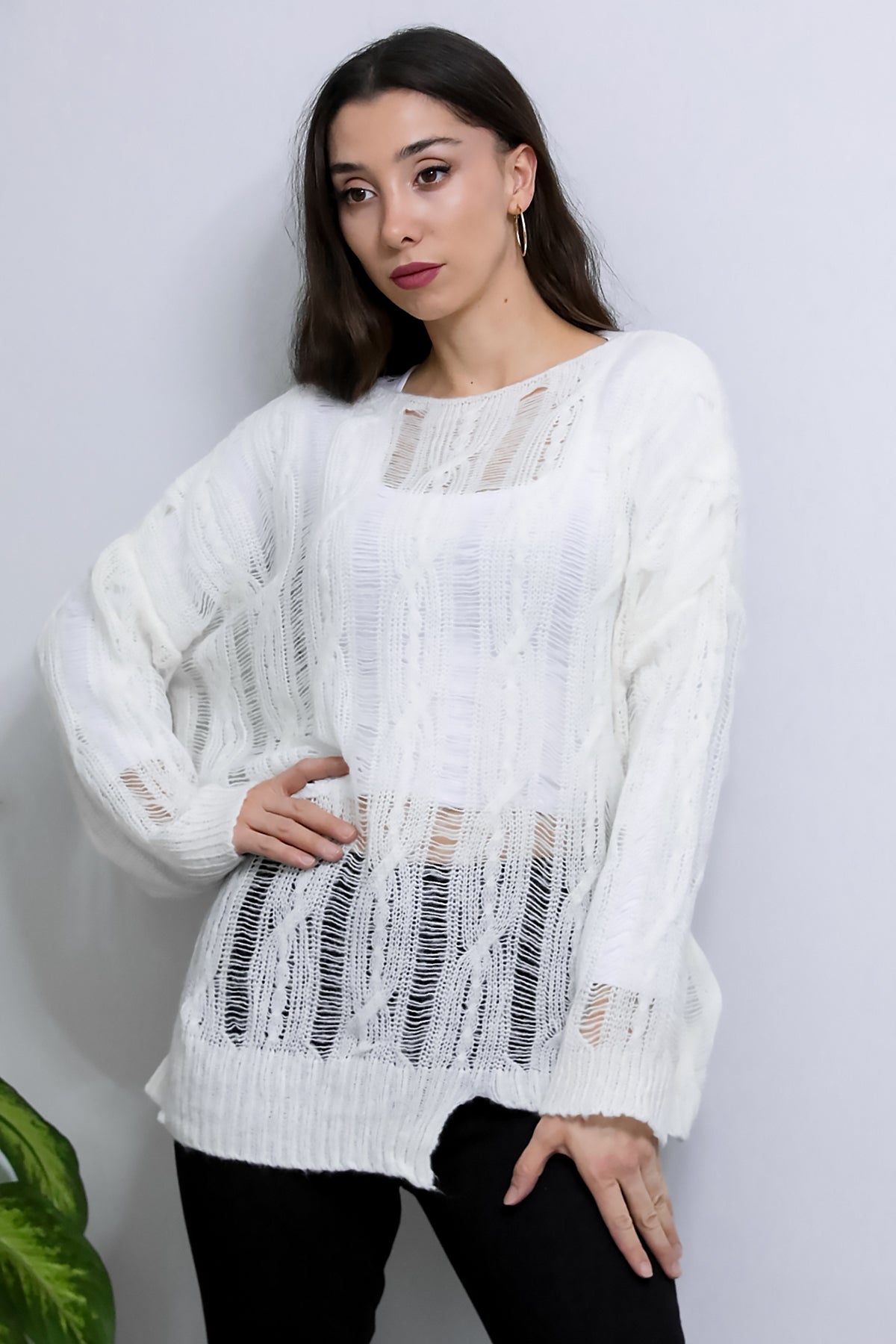 Kadın Kayık Yaka Fileli Triko Bluz Ekru
