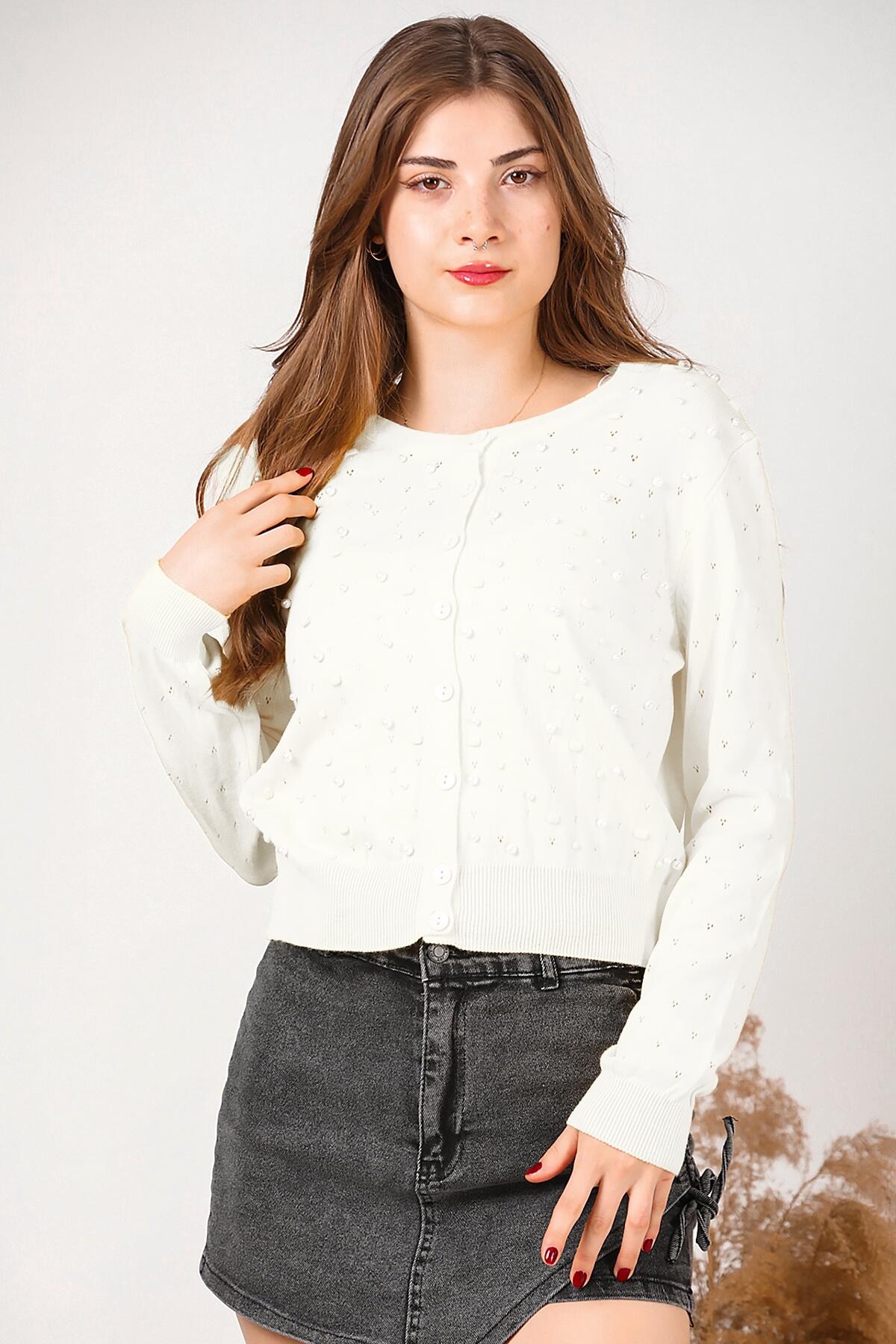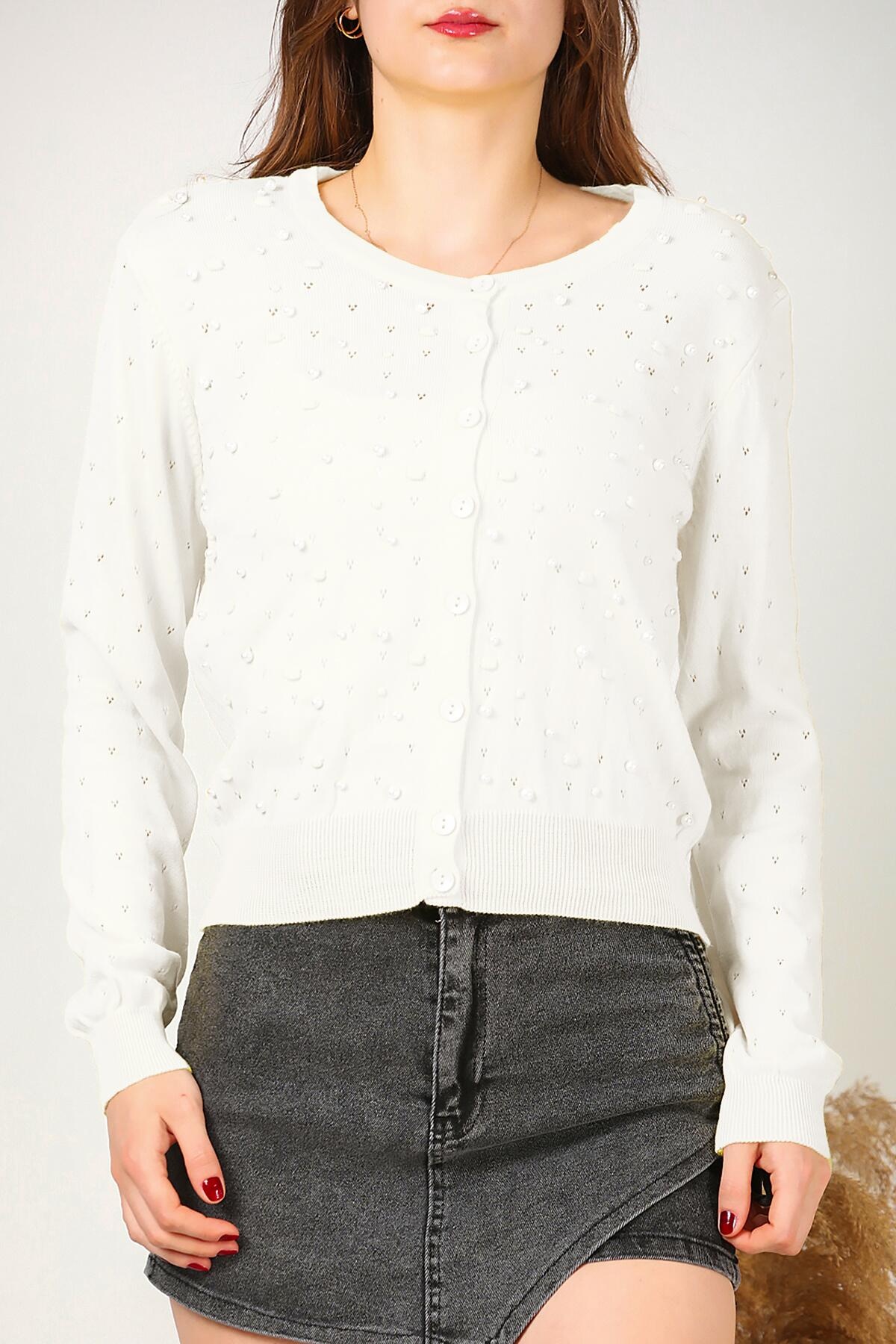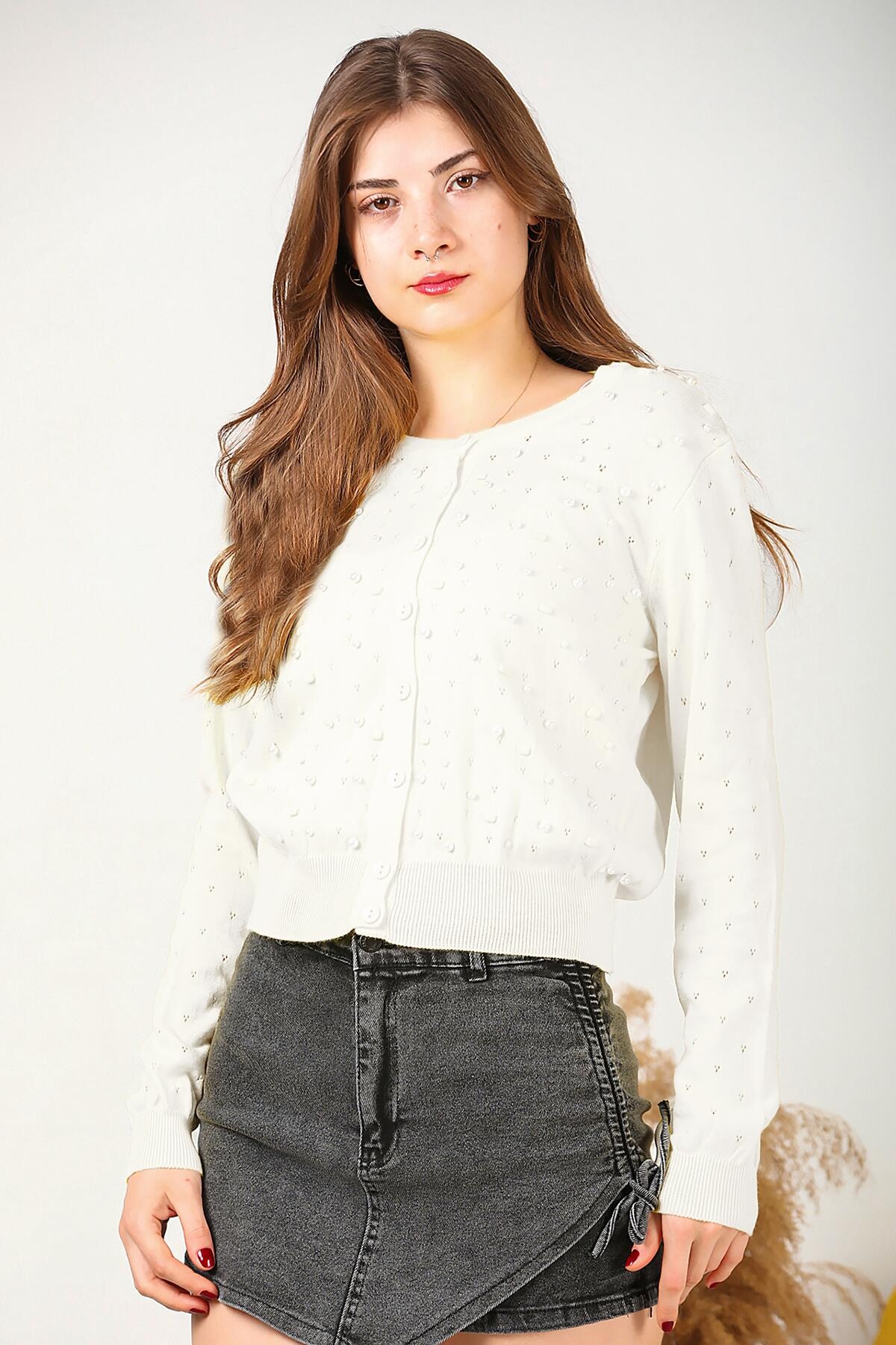 Kadın Kısa İncili Hırka Ekru