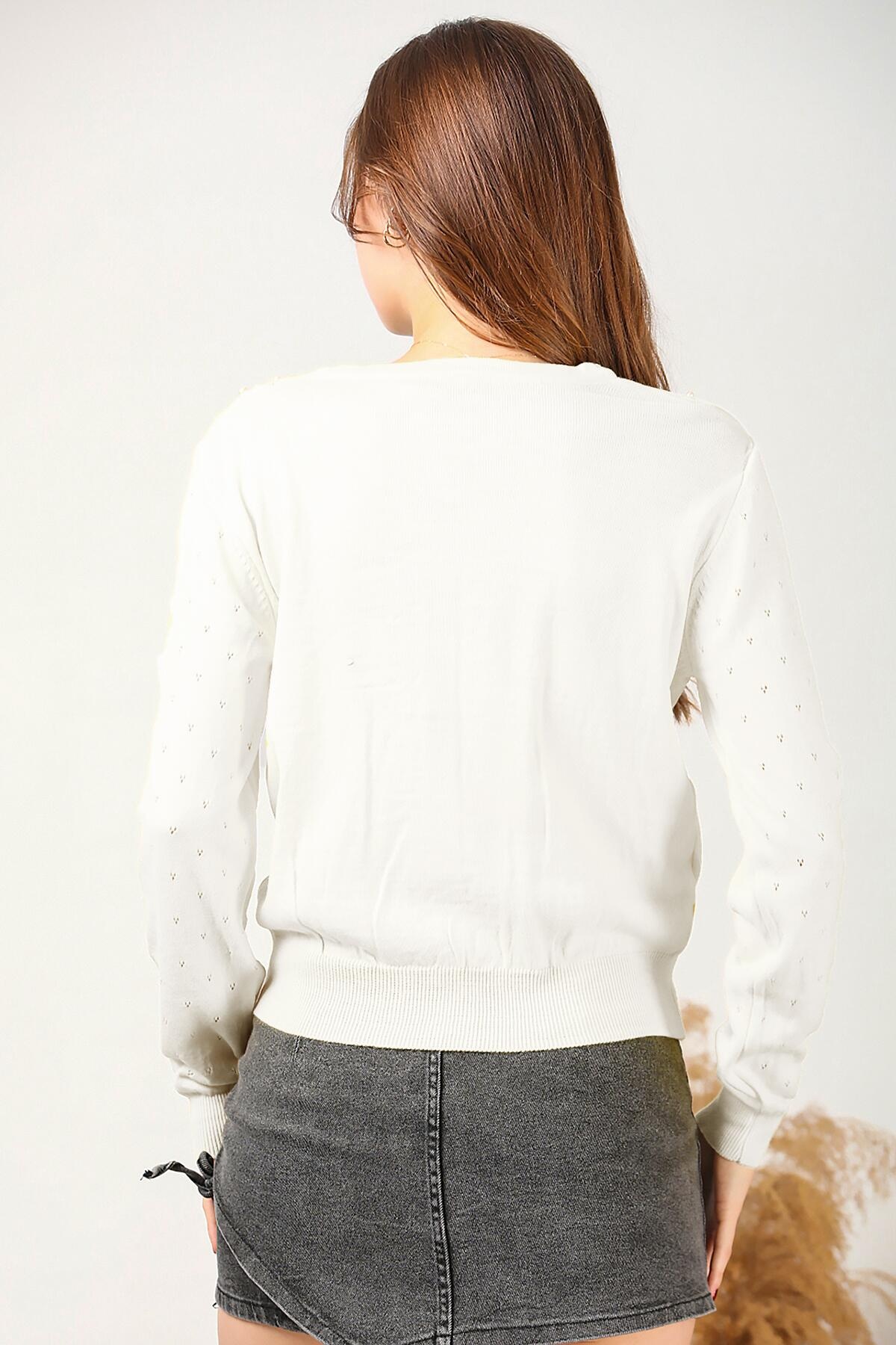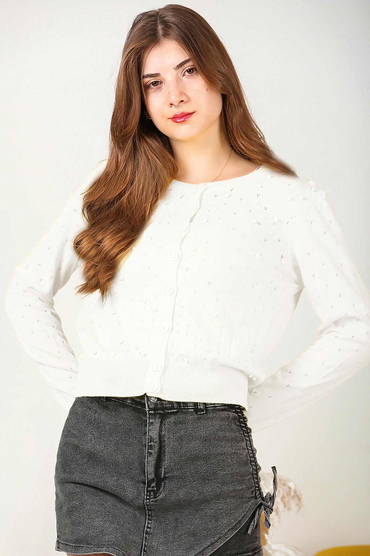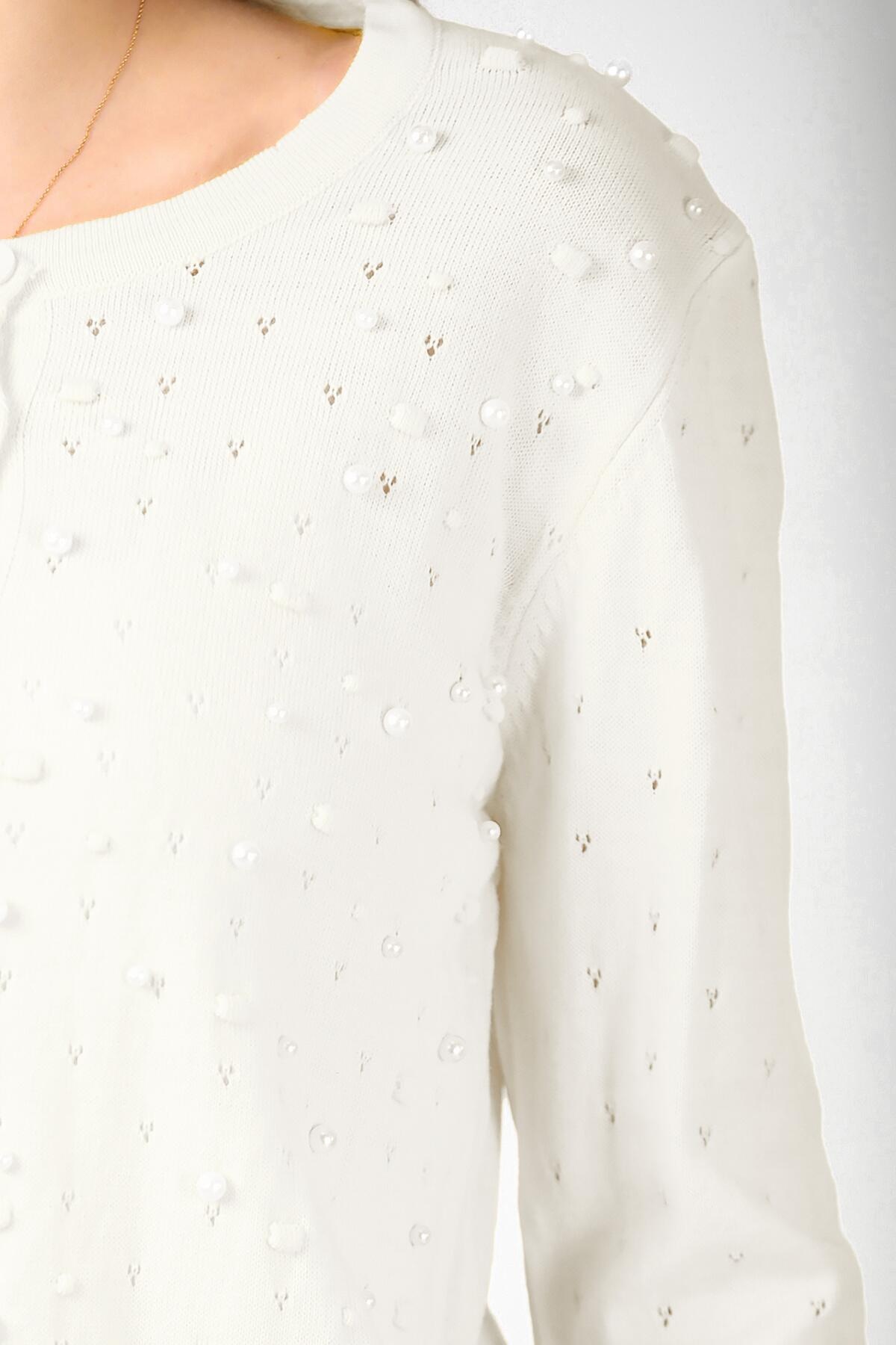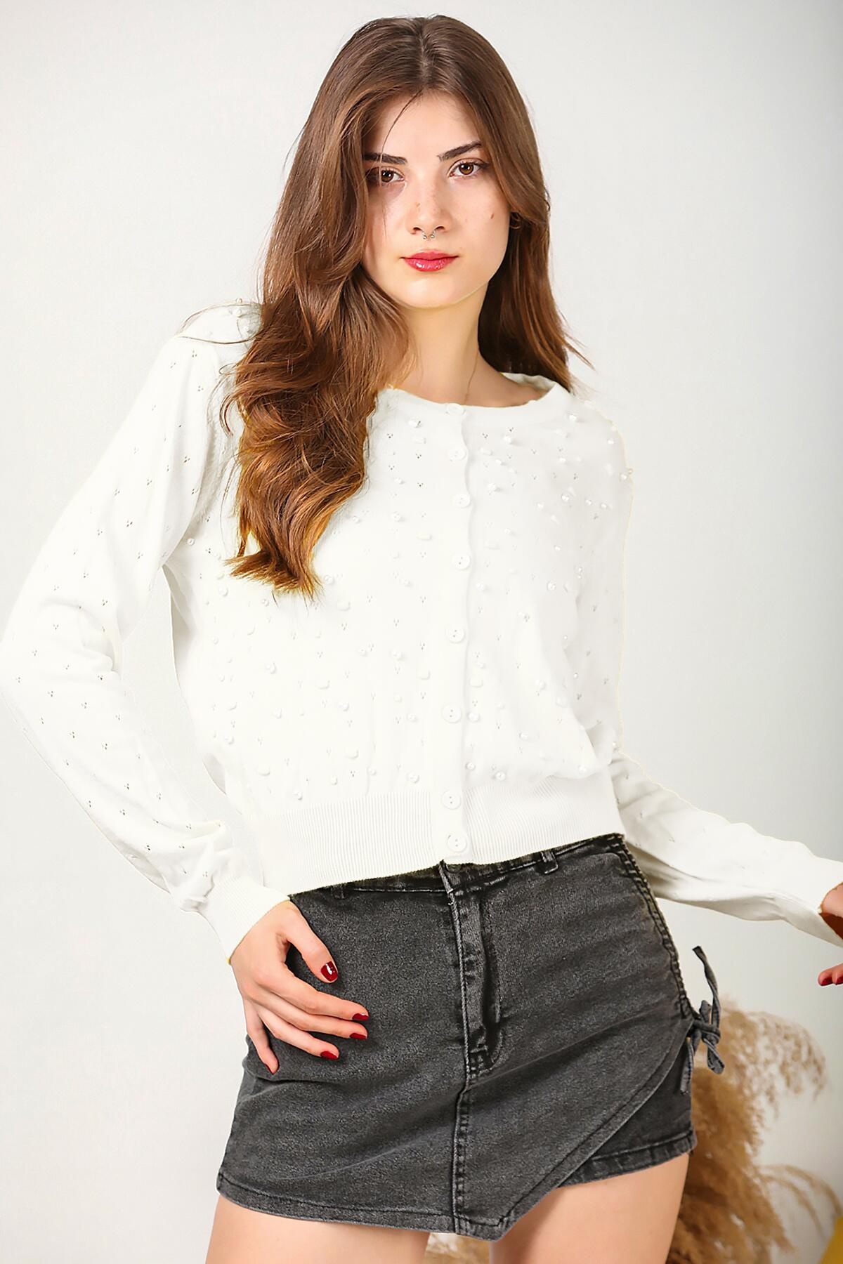 Kadın Kısa İncili Hırka Ekru