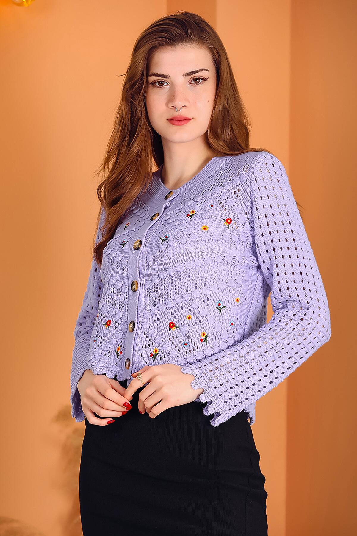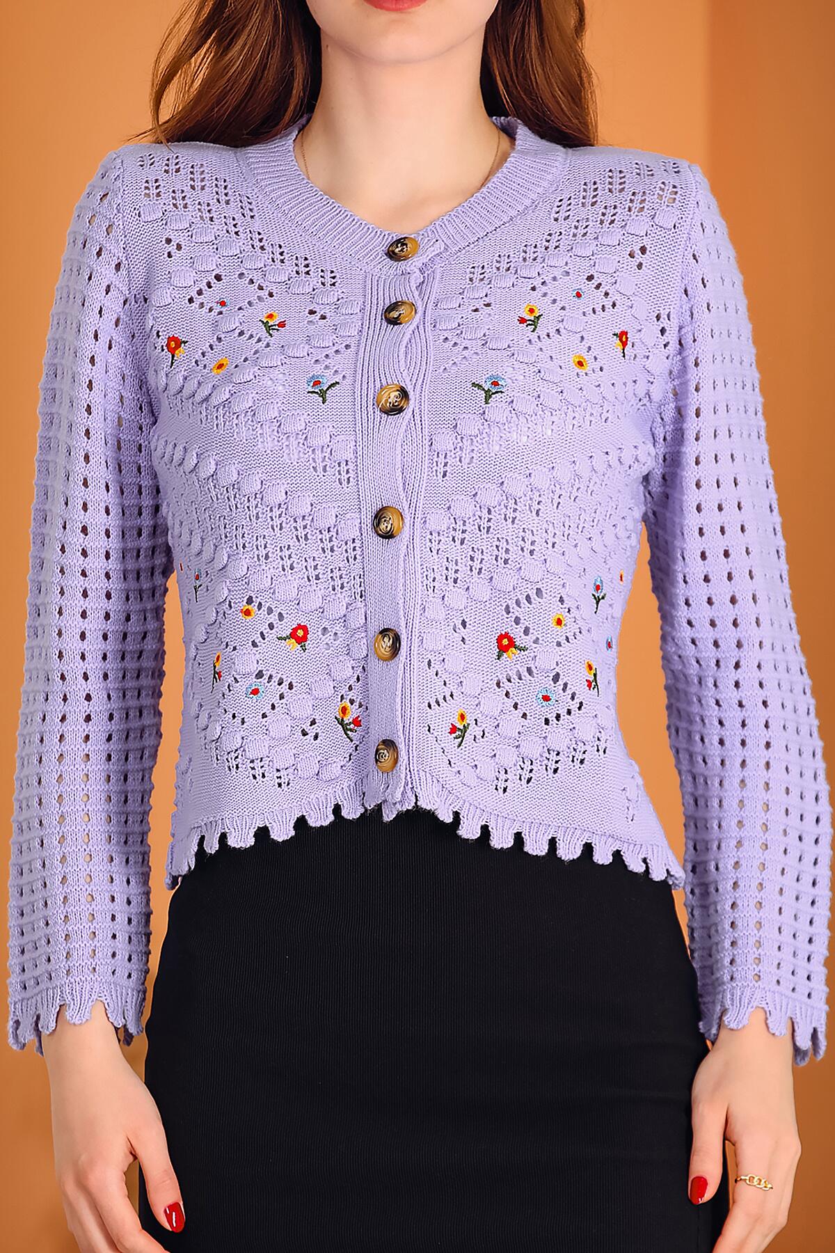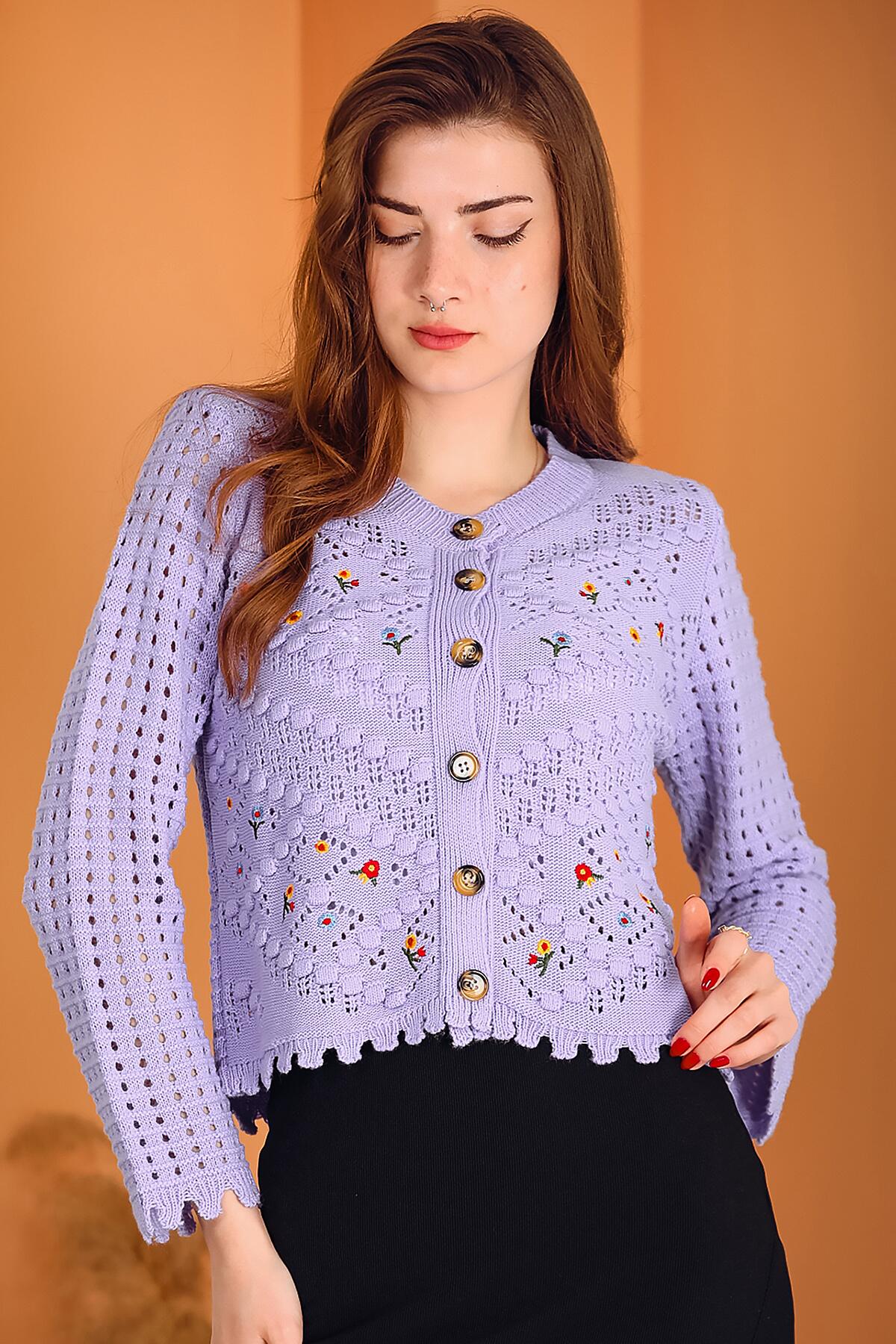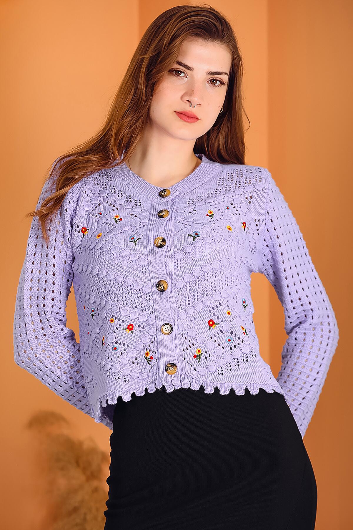 Kadın Nakışlı Düğmeli Kısa Hırka Lila