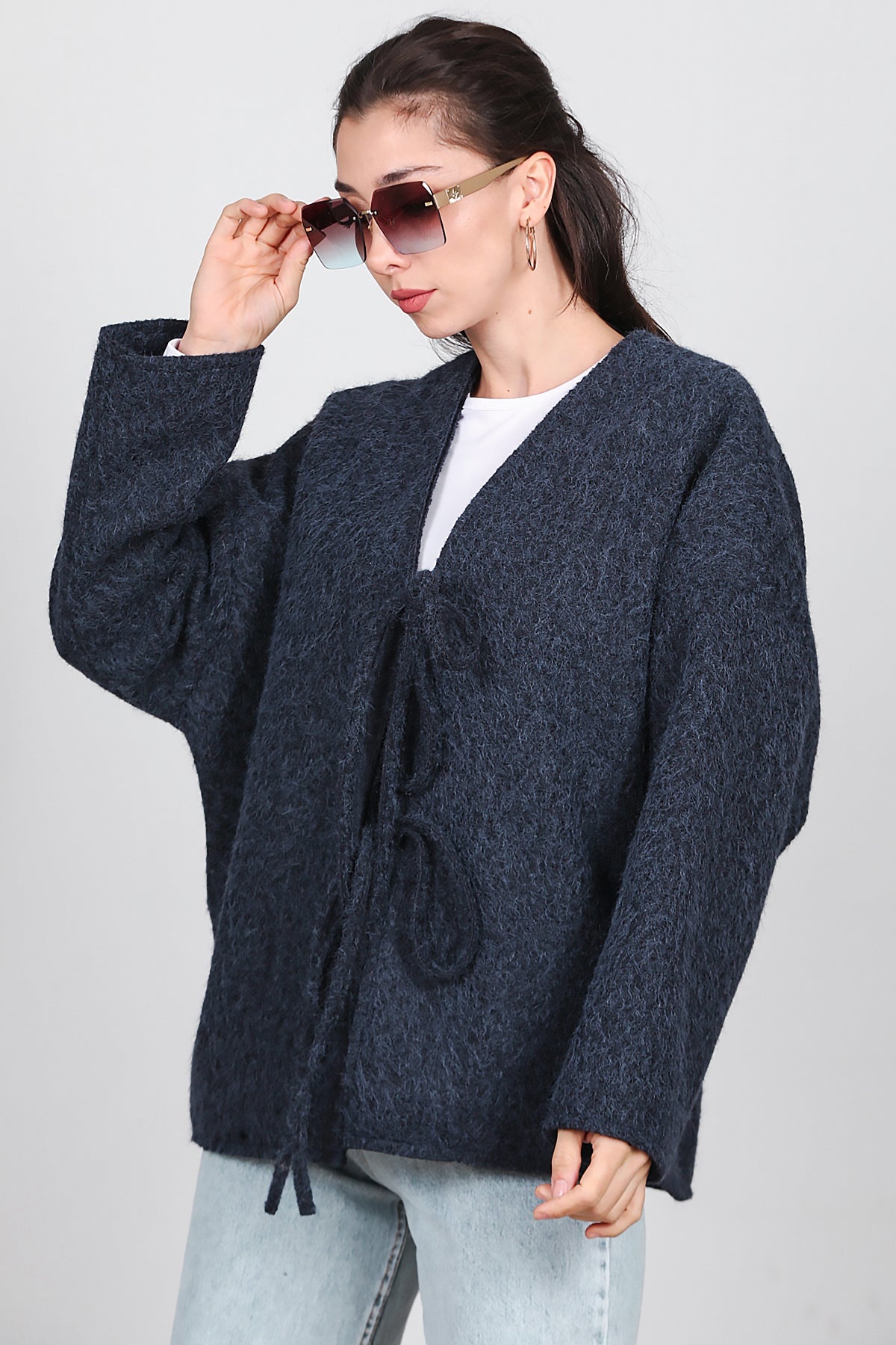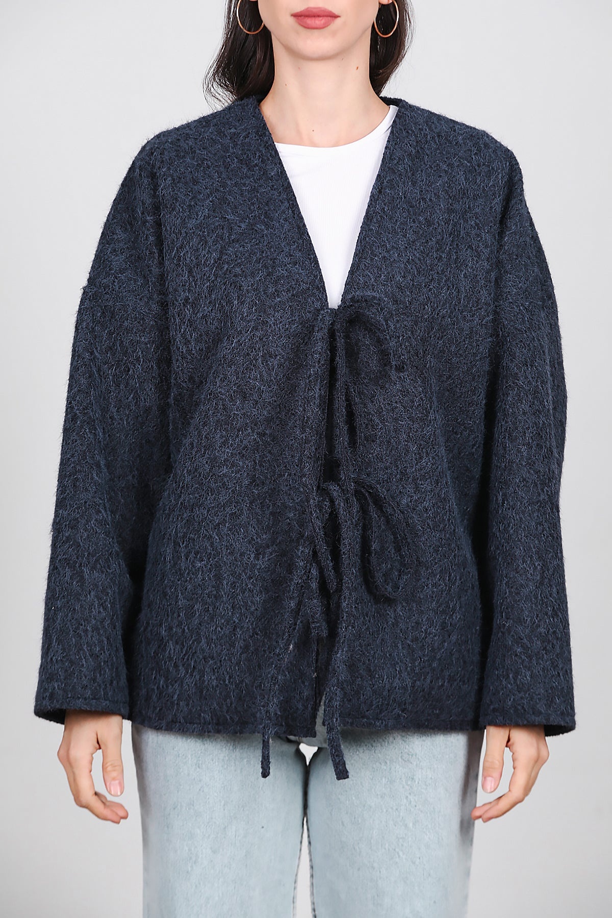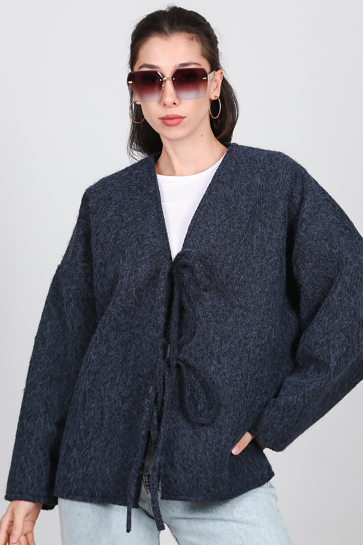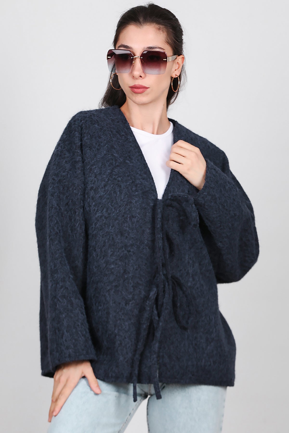Kadın Ön Bağlama Sakallı Kaşe Hırka Lacivert