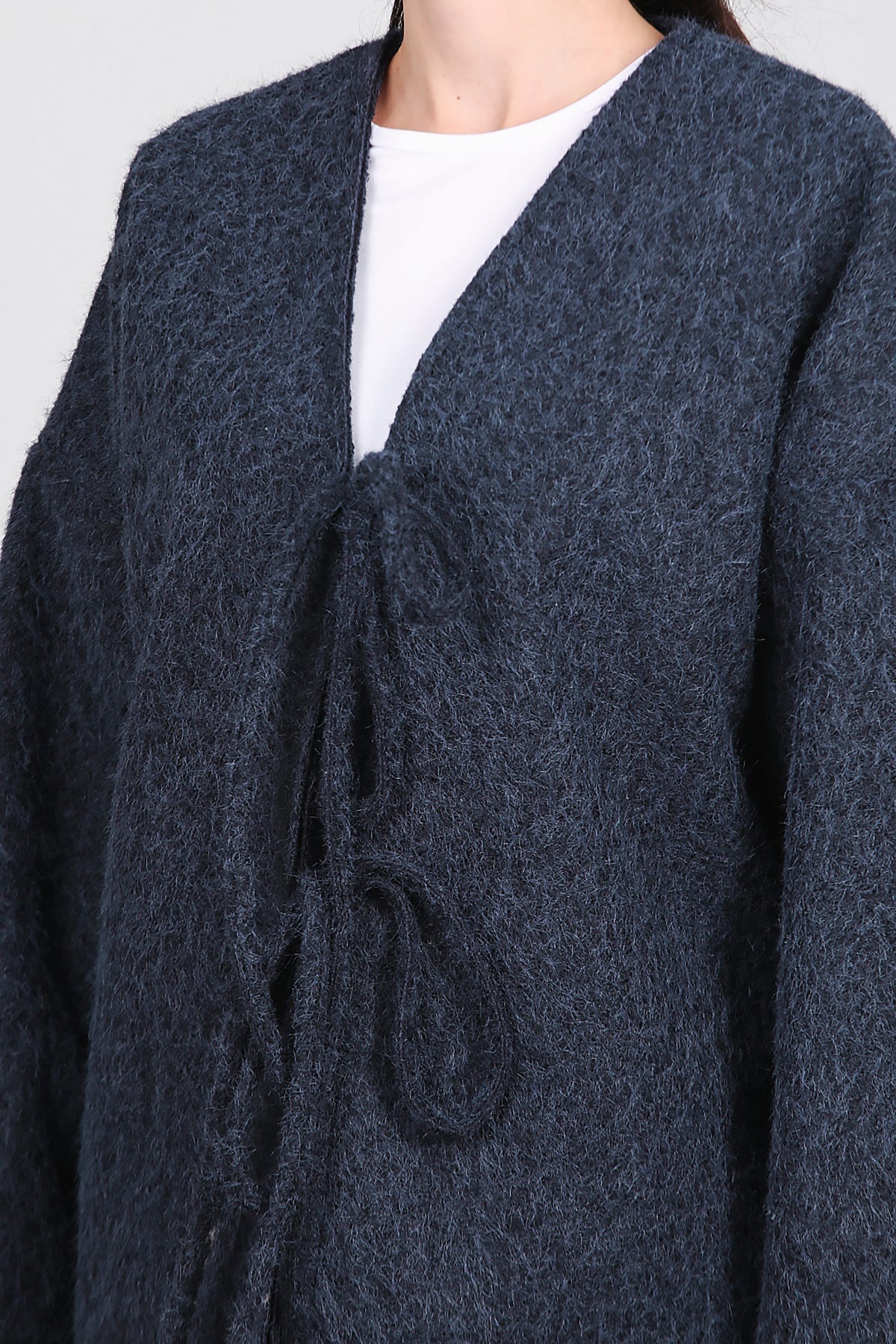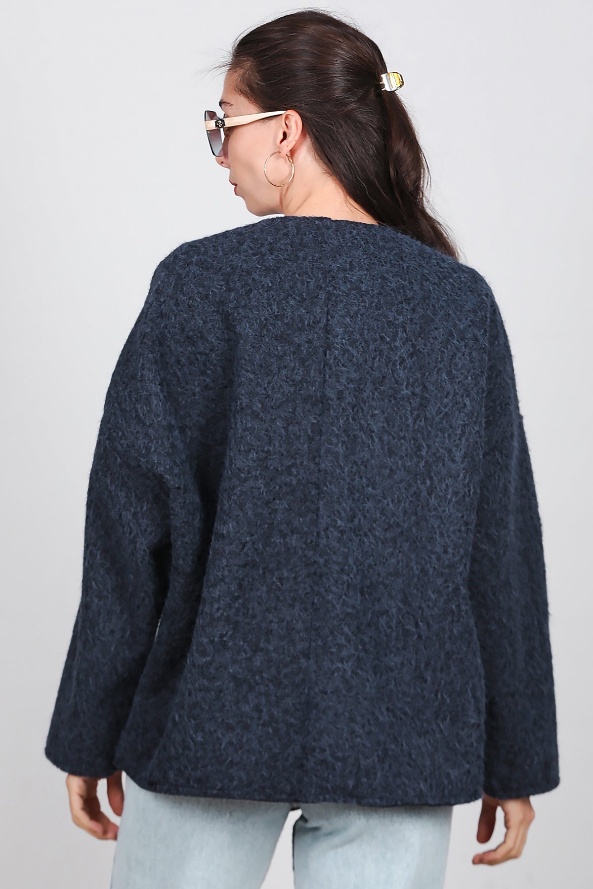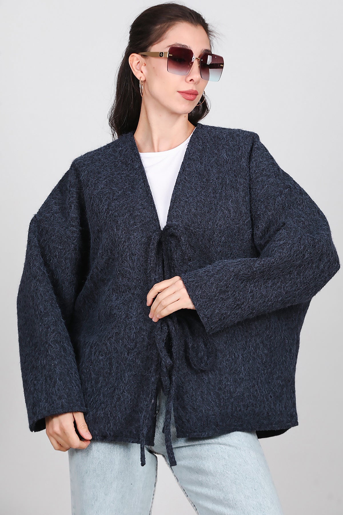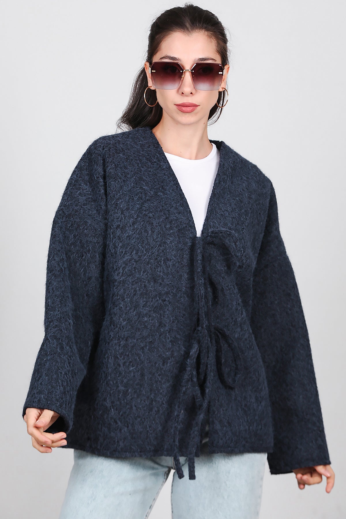 Kadın Ön Bağlama Sakallı Kaşe Hırka Lacivert